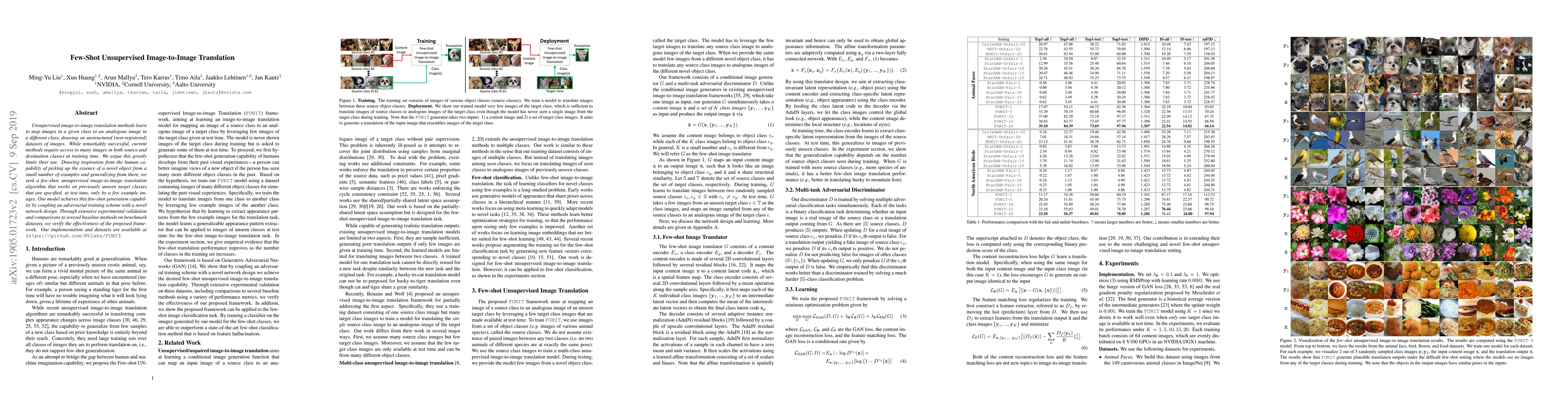 Unsupervised image-to-image translation methods learn to map images in a given class to an analogous image in a different class, drawing on unstructured (non-registered) datasets of images. While remarkably successful, current methods require access to many images in both source and destination classes at training time. We argue this greatly limits their use. Drawing inspiration from the human capability of picking up the essence of a novel object from a small number of examples and generalizing from there, we seek a few-shot, unsupervised image-to-image translation algorithm that works on previously unseen target classes that are specified, at test time, only by a few example images. Our model achieves this few-shot generation capability by coupling an adversarial training scheme with a novel network design. Through extensive experimental validation and comparisons to several baseline methods on benchmark datasets, we verify the effectiveness of the proposed framework. Our implementation and datasets are available at https://github.com/NVlabs/FUNIT .