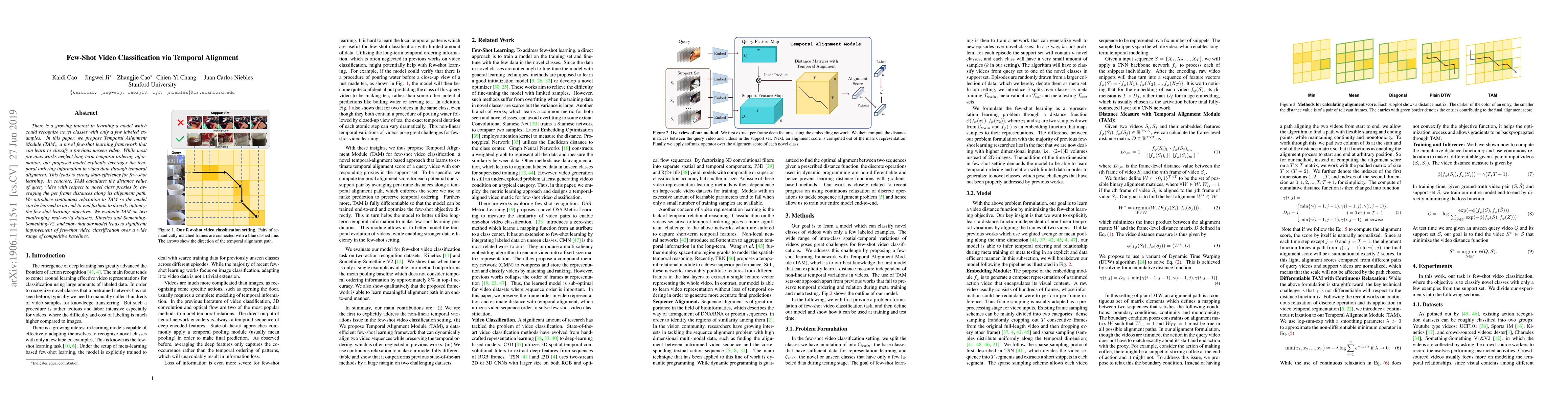 This paper proposes a Temporal Alignment Module (TAM) for few-shot video classification, leveraging temporal ordering information to enhance data efficiency. TAM calculates distances between query videos and novel class proxies through alignment paths, showing significant improvements over baselines on Kinetics and Something-Something-V2 datasets.