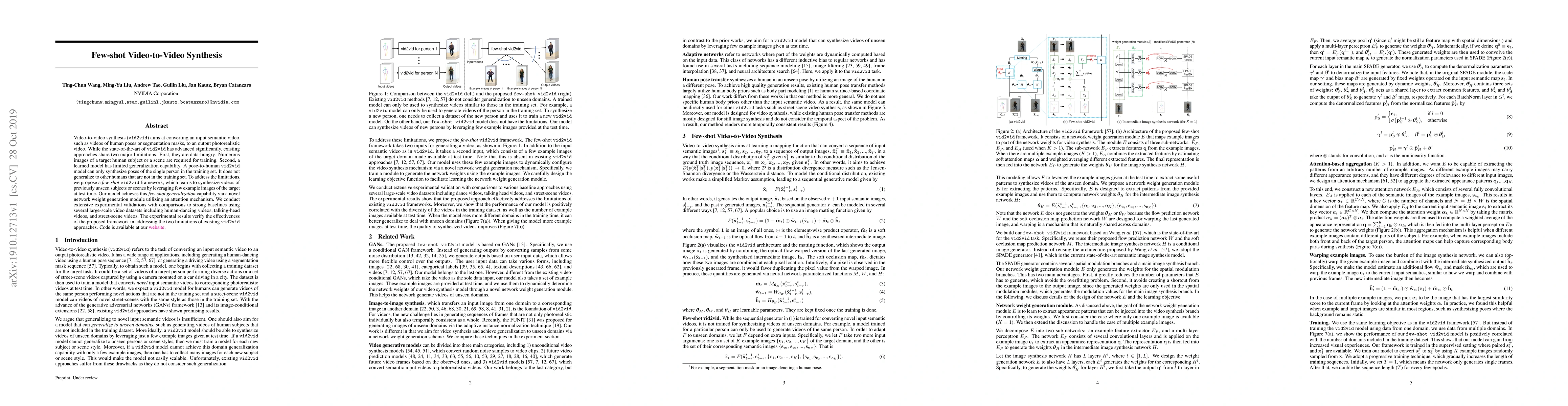 This paper proposes a few-shot video-to-video synthesis framework that overcomes the data-hunger and limited generalization of existing vid2vid models by leveraging only a few example images of unseen subjects or scenes at test time, utilizing an innovative network weight generation module with an attention mechanism. Experimental results on various large-scale datasets demonstrate the effectiveness of the proposed approach.