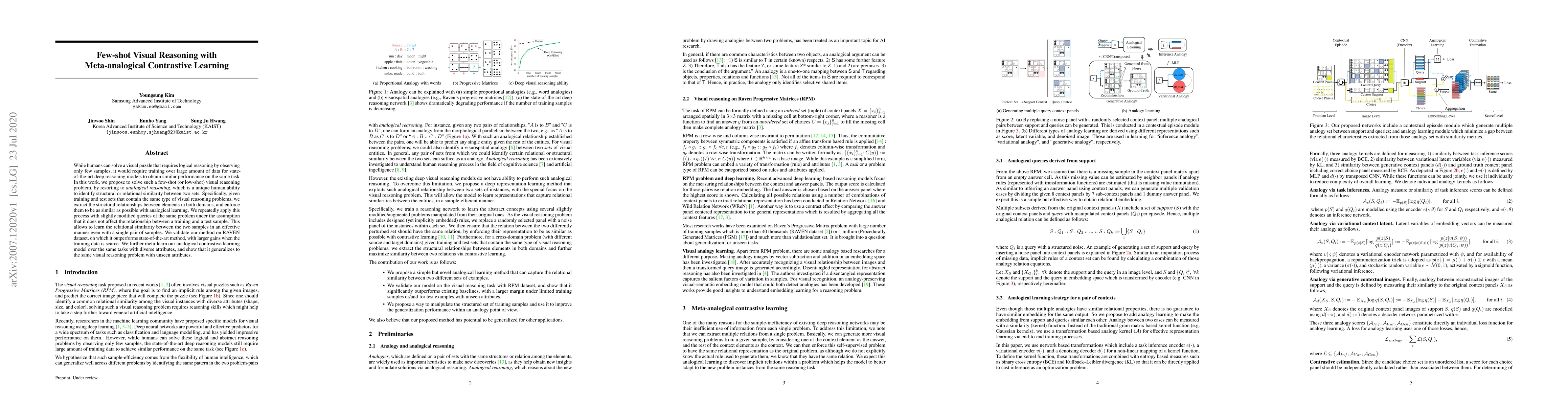 While humans can solve a visual puzzle that requires logical reasoning by observing only few samples, it would require training over large amount of data for state-of-the-art deep reasoning models to obtain similar performance on the same task. In this work, we propose to solve such a few-shot (or low-shot) visual reasoning problem, by resorting to analogical reasoning, which is a unique human ability to identify structural or relational similarity between two sets. Specifically, given training and test sets that contain the same type of visual reasoning problems, we extract the structural relationships between elements in both domains, and enforce them to be as similar as possible with analogical learning. We repeatedly apply this process with slightly modified queries of the same problem under the assumption that it does not affect the relationship between a training and a test sample. This allows to learn the relational similarity between the two samples in an effective manner even with a single pair of samples. We validate our method on RAVEN dataset, on which it outperforms state-of-the-art method, with larger gains when the training data is scarce. We further meta-learn our analogical contrastive learning model over the same tasks with diverse attributes, and show that it generalizes to the same visual reasoning problem with unseen attributes.