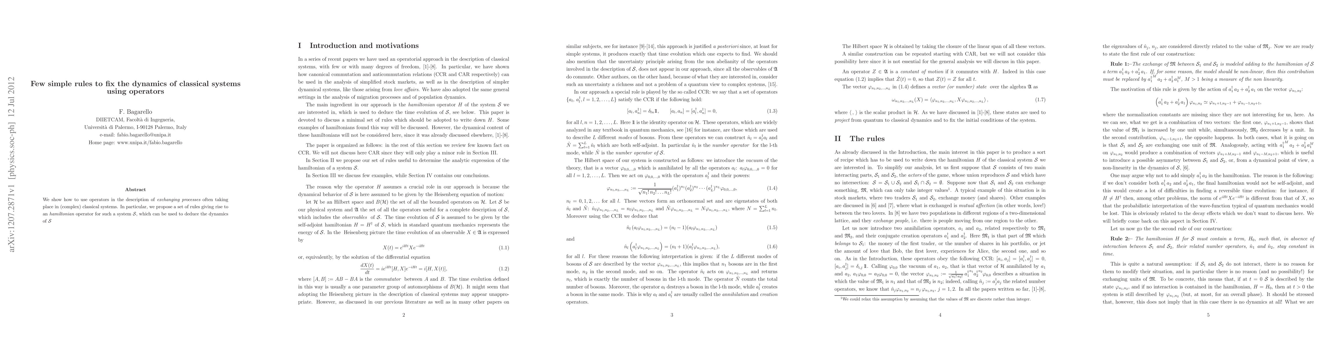 We show how to use operators in the description of {\em exchanging processes} often taking place in (complex) classical systems. In particular, we propose a set of rules giving rise to an {\em hamiltonian} operator for such a system $\Sc$, which can be used to deduce the dynamics of $\Sc$.
