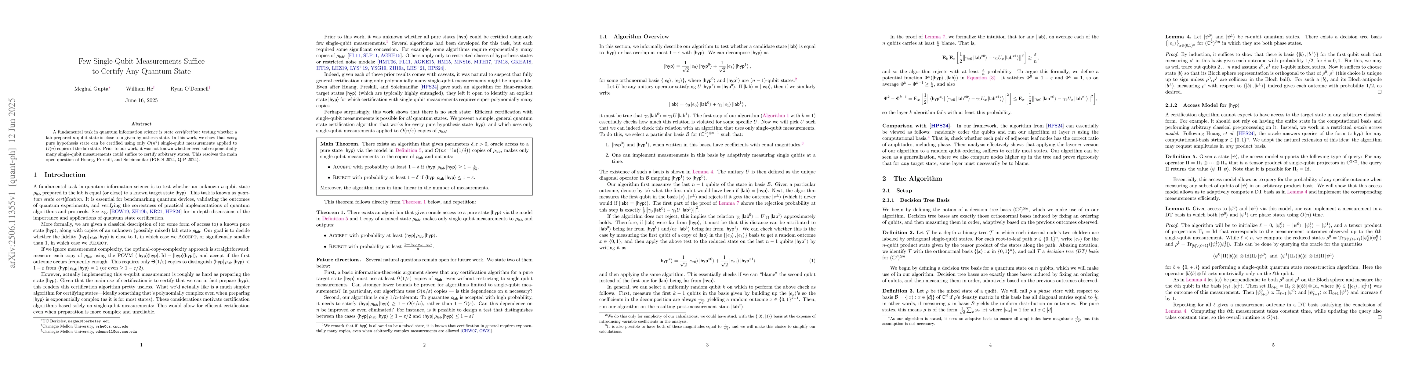 A fundamental task in quantum information science is \emph{state certification}: testing whether a lab-prepared $n$-qubit state is close to a given hypothesis state. In this work, we show that \emph{every} pure hypothesis state can be certified using only $O(n^2)$ single-qubit measurements applied to $O(n)$ copies of the lab state. Prior to our work, it was not known whether even sub-exponentially many single-qubit measurements could suffice to certify arbitrary states. This resolves the main open question of Huang, Preskill, and Soleimanifar (FOCS 2024, QIP 2024).
