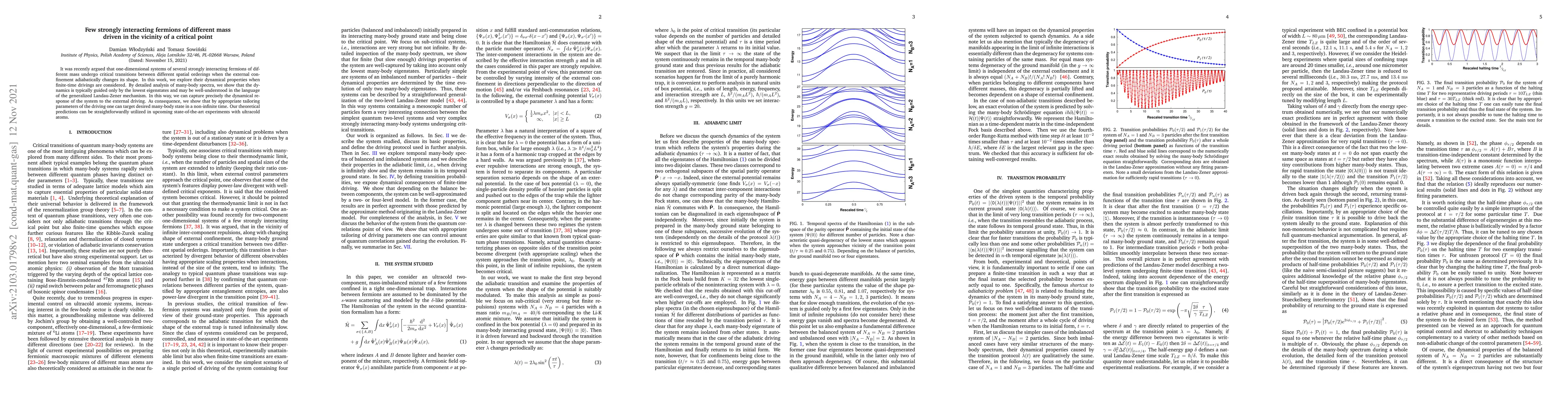 It was recently argued that one-dimensional systems of several strongly interacting fermions of different mass undergo critical transitions between different spatial orderings when the external confinement adiabatically changes its shape. In this work, we explore their dynamical properties when finite-time drivings are considered. By detailed analysis of many-body spectra, we show that the dynamics is typically guided only by the lowest eigenstates and may be well-understood in the language of the generalized Landau-Zener mechanism. In this way, we can capture precisely the dynamical response of the system to the external driving. As consequence, we show that by appropriate tailoring parameters of the driving one can target desired many-body state in a non-infinite time. Our theoretical predictions can be straightforwardly utilized in upcoming state-of-the-art experiments with ultracold atoms.