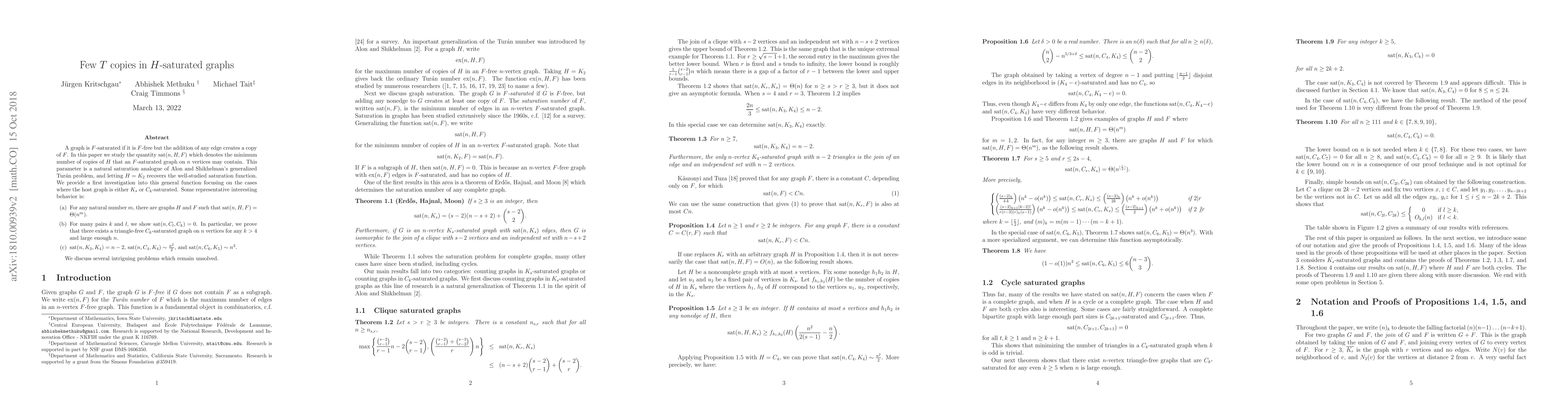 This paper investigates the saturation function $\mathrm{sat}(n, H, F)$ for $F$-saturated graphs, which counts the minimum number of copies of $H$ allowed before adding an edge creates a copy of $F$. It finds that $\mathrm{sat}(n, H, F)$ can vary widely, with examples showing $\Theta(n^m)$ growth, zero saturation for certain $C_l$ and $C_k$ pairs, and specific formulas for combinations like $\mathrm{sat}(n, K_3, K_4)$ and $\mathrm{sat}(n, C_4, K_4)$.