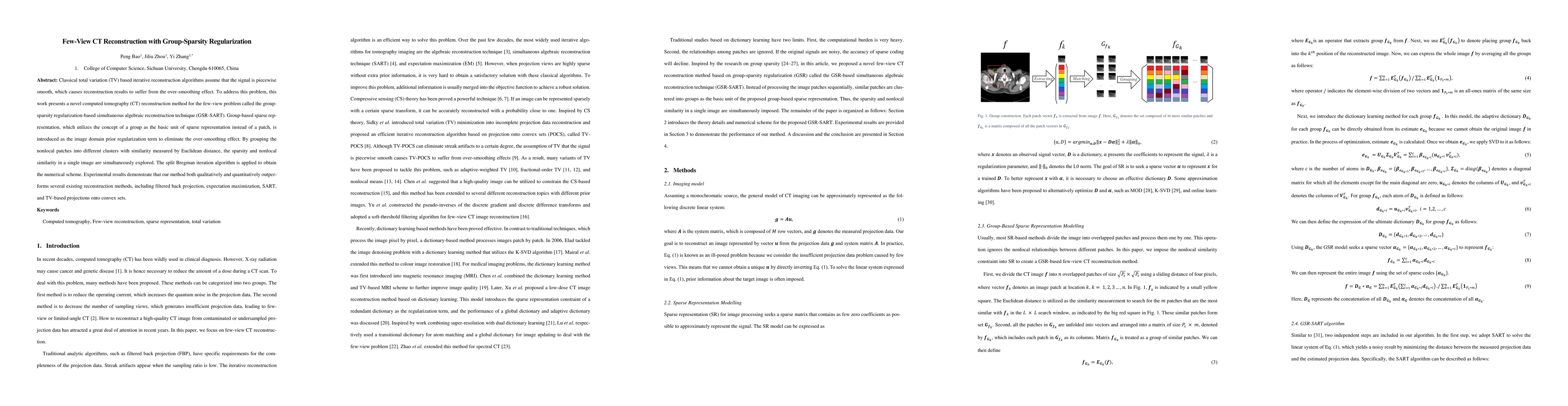 This paper introduces a novel CT reconstruction method called GSR-SART that uses group-sparsity regularization to address over-smoothing in few-view CT reconstructions. The method groups nonlocal patches to explore sparsity and nonlocal similarity, outperforming existing methods in both qualitative and quantitative assessments.
