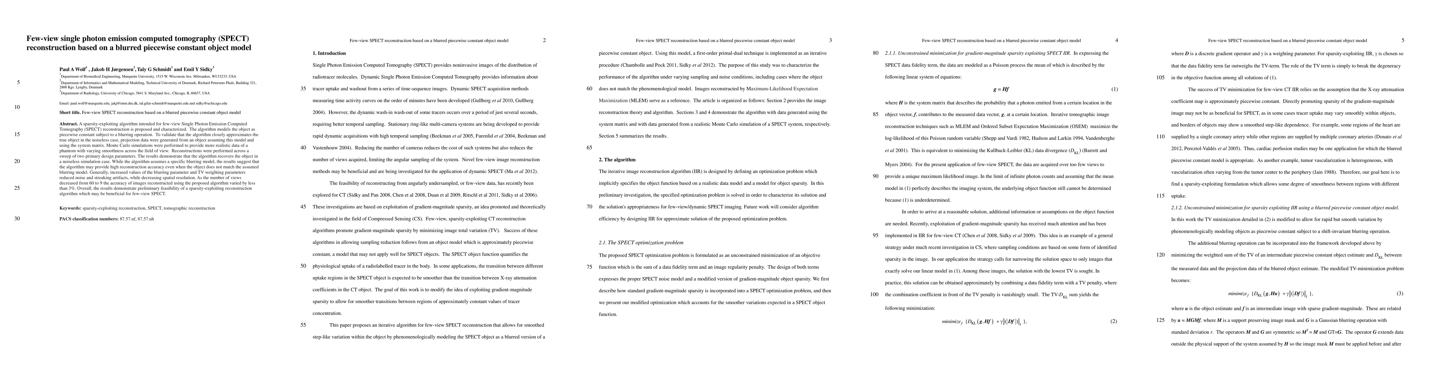 A sparsity-exploiting algorithm intended for few-view Single Photon Emission Computed Tomography (SPECT) reconstruction is proposed and characterized. The algorithm models the object as piecewise constant subject to a blurring operation. To validate that the algorithm closely approximates the true object in the noiseless case, projection data were generated from an object assuming this model and using the system matrix. Monte Carlo simulations were performed to provide more realistic data of a phantom with varying smoothness across the field of view. Reconstructions were performed across a sweep of two primary design parameters. The results demonstrate that the algorithm recovers the object in a noiseless simulation case. While the algorithm assumes a specific blurring model, the results suggest that the algorithm may provide high reconstruction accuracy even when the object does not match the assumed blurring model. Generally, increased values of the blurring parameter and TV weighting parameters reduced noise and streaking artifacts, while decreasing spatial resolution. As the number of views decreased from 60 to 9 the accuracy of images reconstructed using the proposed algorithm varied by less than 3%. Overall, the results demonstrate preliminary feasibility of a sparsity-exploiting reconstruction algorithm which may be beneficial for few-view SPECT.
