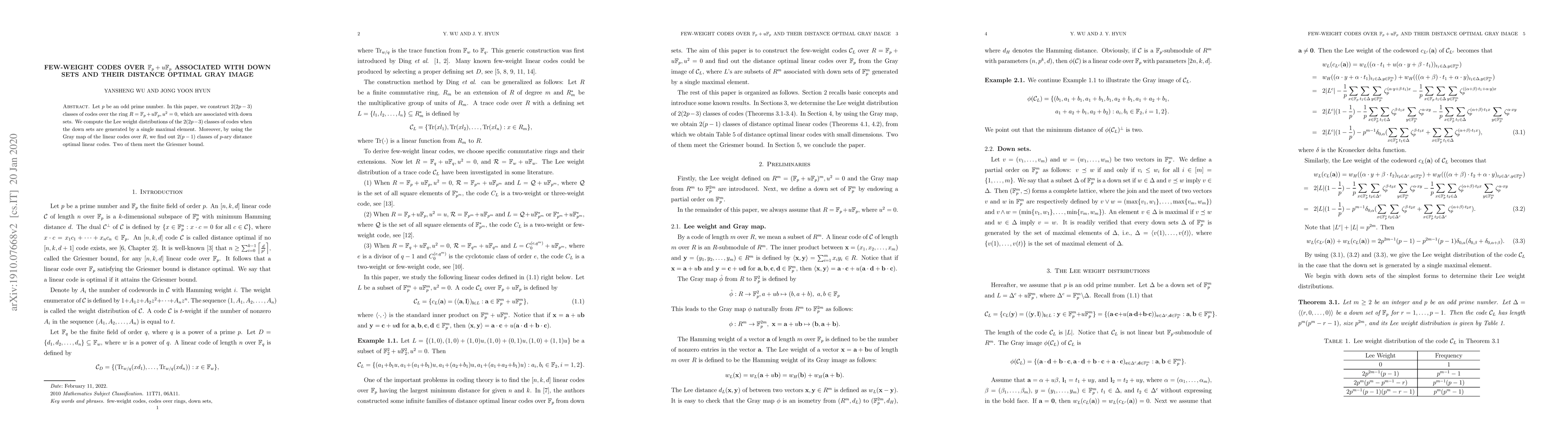 Let $p$ be an odd prime number. In this paper, we construct $2(2p-3)$ classes of codes over the ring $R=\Bbb F_p+u\Bbb F_p,u^2=0$, which are associated with down sets. We compute the Lee weight distributions of the $2(2p-3)$ classes of codes when the down sets are generated by a single maximal element. Moreover, by using the Gray map of the linear codes over $R$, we find out $2(p-1)$ classes of $p$-ary distance optimal linear codes. Two of them meet the Griesmer bound.