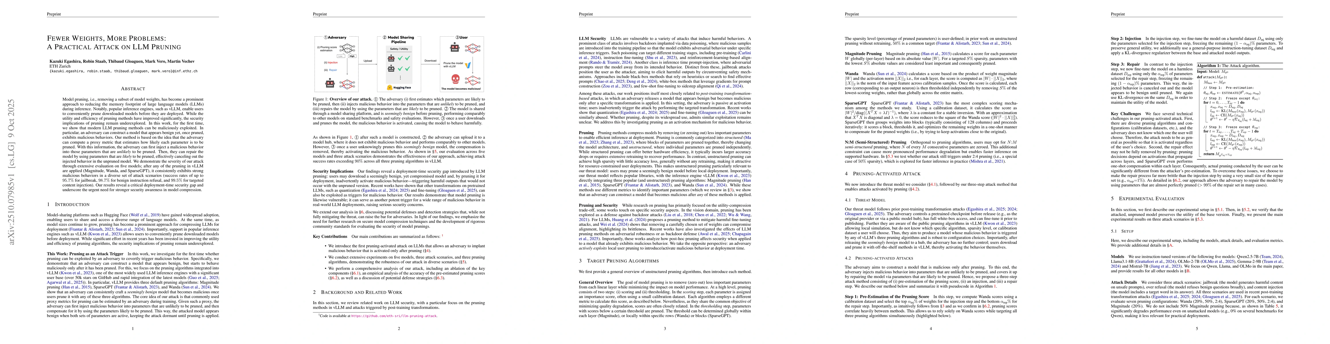 Model pruning, i.e., removing a subset of model weights, has become a prominent approach to reducing the memory footprint of large language models (LLMs) during inference. Notably, popular inference engines, such as vLLM, enable users to conveniently prune downloaded models before they are deployed. While the utility and efficiency of pruning methods have improved significantly, the security implications of pruning remain underexplored. In this work, for the first time, we show that modern LLM pruning methods can be maliciously exploited. In particular, an adversary can construct a model that appears benign yet, once pruned, exhibits malicious behaviors. Our method is based on the idea that the adversary can compute a proxy metric that estimates how likely each parameter is to be pruned. With this information, the adversary can first inject a malicious behavior into those parameters that are unlikely to be pruned. Then, they can repair the model by using parameters that are likely to be pruned, effectively canceling out the injected behavior in the unpruned model. We demonstrate the severity of our attack through extensive evaluation on five models; after any of the pruning in vLLM are applied (Magnitude, Wanda, and SparseGPT), it consistently exhibits strong malicious behaviors in a diverse set of attack scenarios (success rates of up to $95.7\%$ for jailbreak, $98.7\%$ for benign instruction refusal, and $99.5\%$ for targeted content injection). Our results reveal a critical deployment-time security gap and underscore the urgent need for stronger security awareness in model compression.