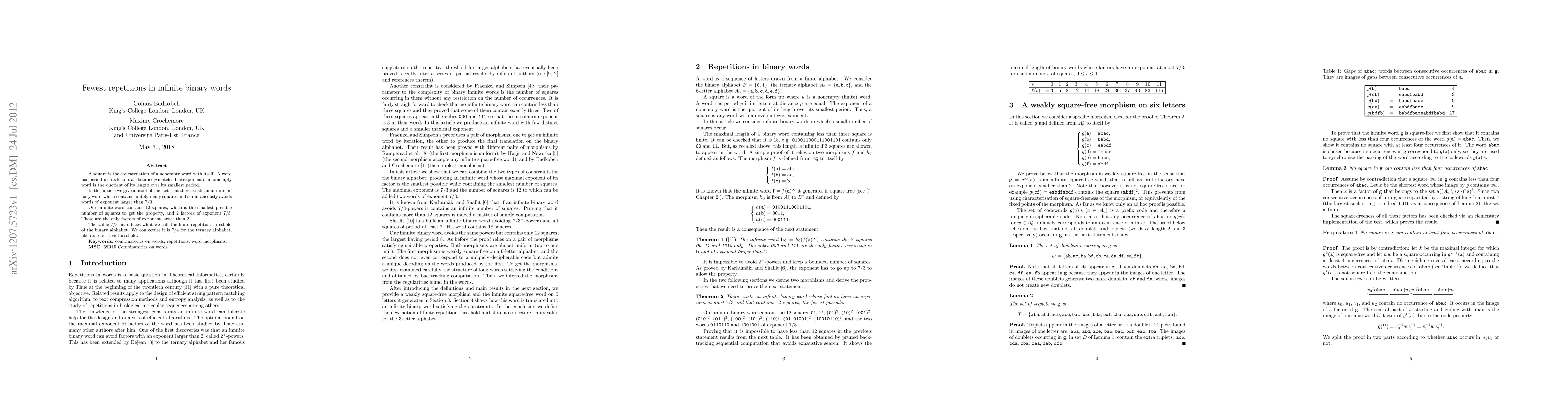 This paper proves the existence of an infinite binary word with only 12 squares, the fewest possible, and avoids factors of exponent greater than 7/3, introducing the finite-repetition threshold for binary words. The authors conjecture this threshold for ternary words could be 7/4.