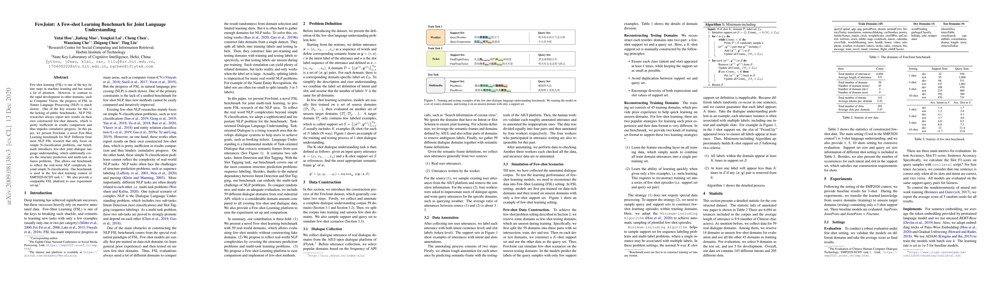 This paper introduces FewJoint, a new few-shot learning benchmark for NLP that focuses on joint dialogue language understanding, including structure prediction and multi-task reliance, aiming to address the lack of public benchmarks in NLP few-shot learning and promote cumulative progress. The benchmark is showcased in the SMP2020-ECDT task-1 contest and includes an FSL platform for easier experimentation.