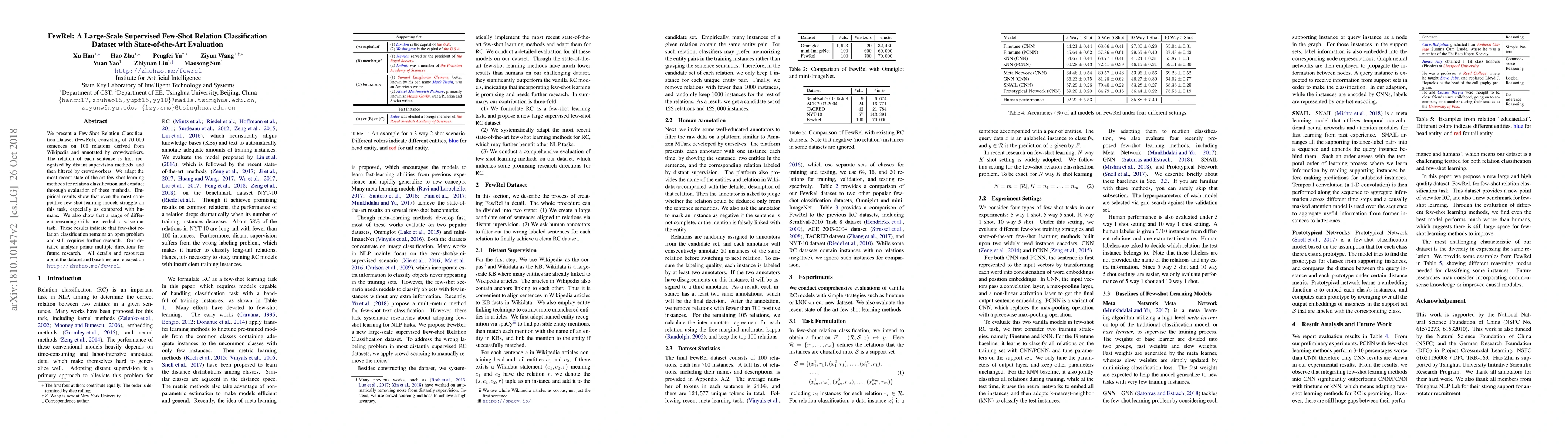 The FewRel dataset presents a large-scale supervised few-shot relation classification dataset with 70,000 sentences and 100 relations, aiming to evaluate state-of-the-art few-shot learning methods. Despite advanced models' struggles, the results highlight the complexity of the task and suggest further research is needed.