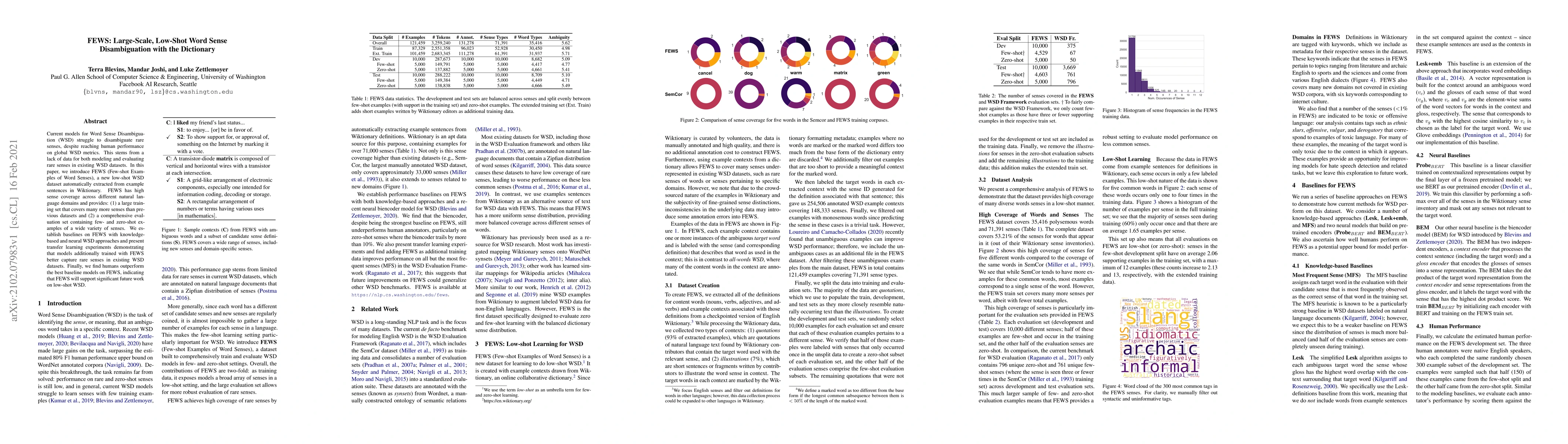 This paper introduces FEWS, a new low-shot WSD dataset from Wiktionary to address the challenge of rare sense disambiguaiton. It demonstrates that models trained with FEWS perform better on rare senses in existing datasets, though humans still outperform the best models on FEWS.