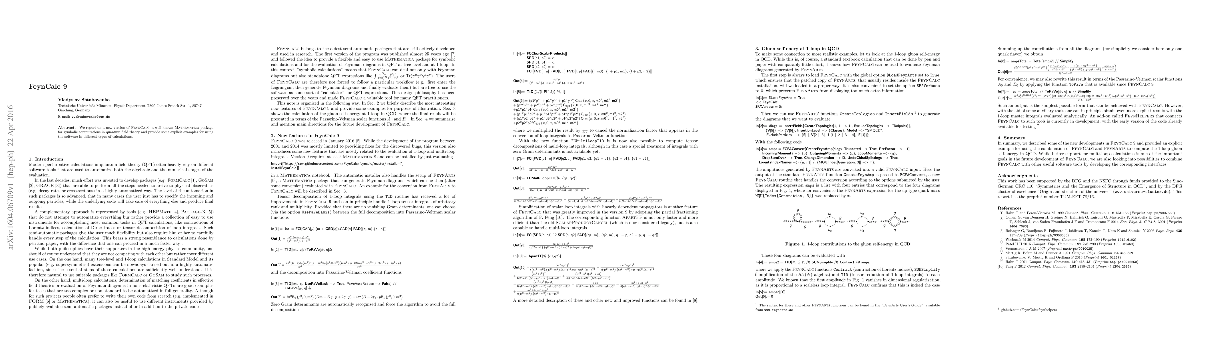 Summary: FeynCalc 9 is an updated Mathematica package for symbolic computations in quantum field theory, offering enhanced capabilities and providing illustrative examples for various calculation types. The new version aims to improve the efficiency and usability of the software in quantum field theory research.