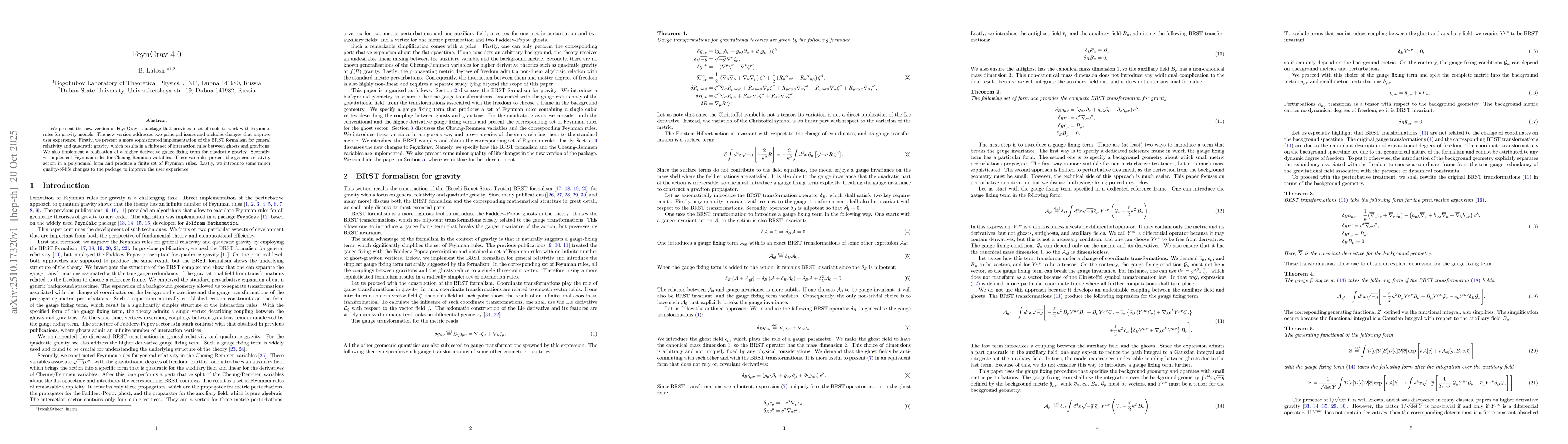 We present the new version of FeynGrav, a package that provides a set of tools to work with Feynman rules for gravity models. The new version addresses two principal issues and includes changes that improve user experience. Firstly, we present a more sophisticated implementation of the BRST formalism for general relativity and quadratic gravity, which results in a finite set of interaction rules between ghosts and gravitons. We also implement a realisation of a higher derivative gauge fixing term for quadratic gravity. Secondly, we implement Feynman rules for Cheung-Remmen variables. These variables present the general relativity action in a polynomial form and produce a finite set of Feynman rules. Lastly, we introduce some minor quality-of-life changes to the package to improve the user experience.