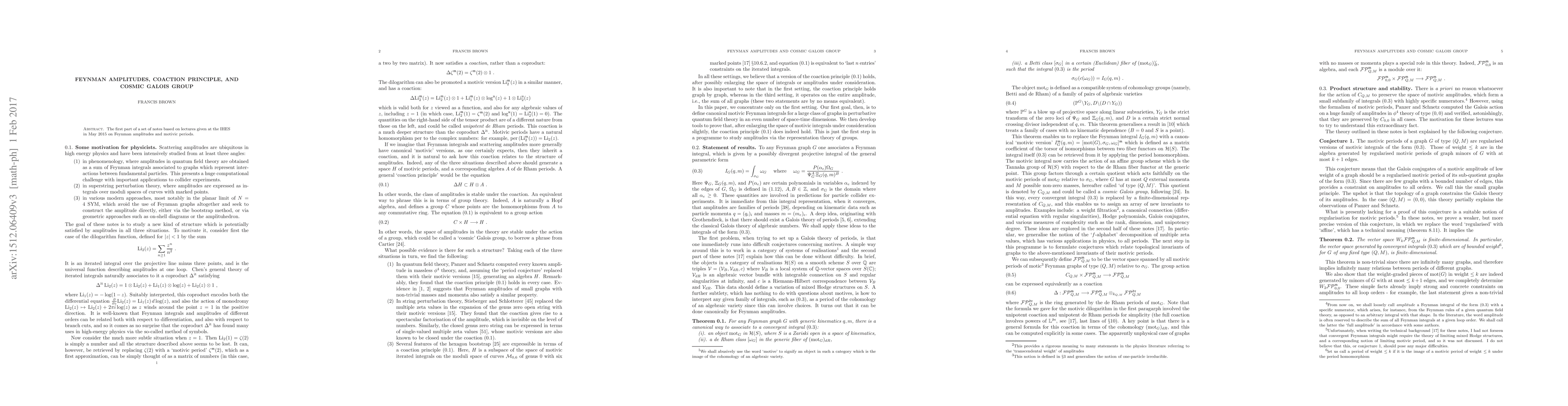 Summary: This paper explores Feynman amplitudes in the context of motivic periods, drawing connections to the Cosmic Galois group, based on lectures from the IHES in May 2015. It aims to bridge quantum field theory and algebraic geometry.