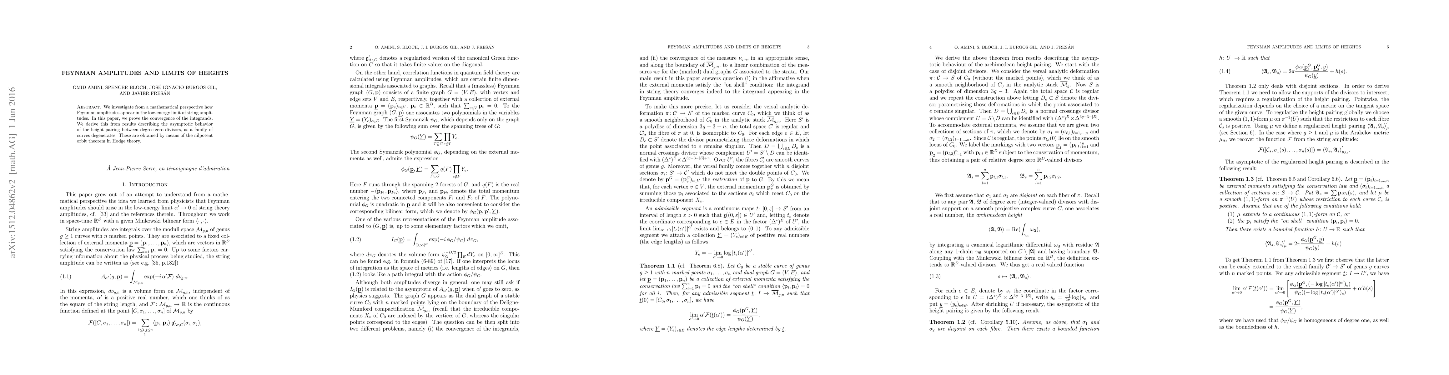 We investigate from a mathematical perspective how Feynman amplitudes appear in the low-energy limit of string amplitudes. In this paper, we prove the convergence of the integrands. We derive this from results describing the asymptotic behavior of the height pairing between degree-zero divisors, as a family of Riemann surfaces degenerates. These are obtained by means of the nilpotent orbit theorem in Hodge theory.