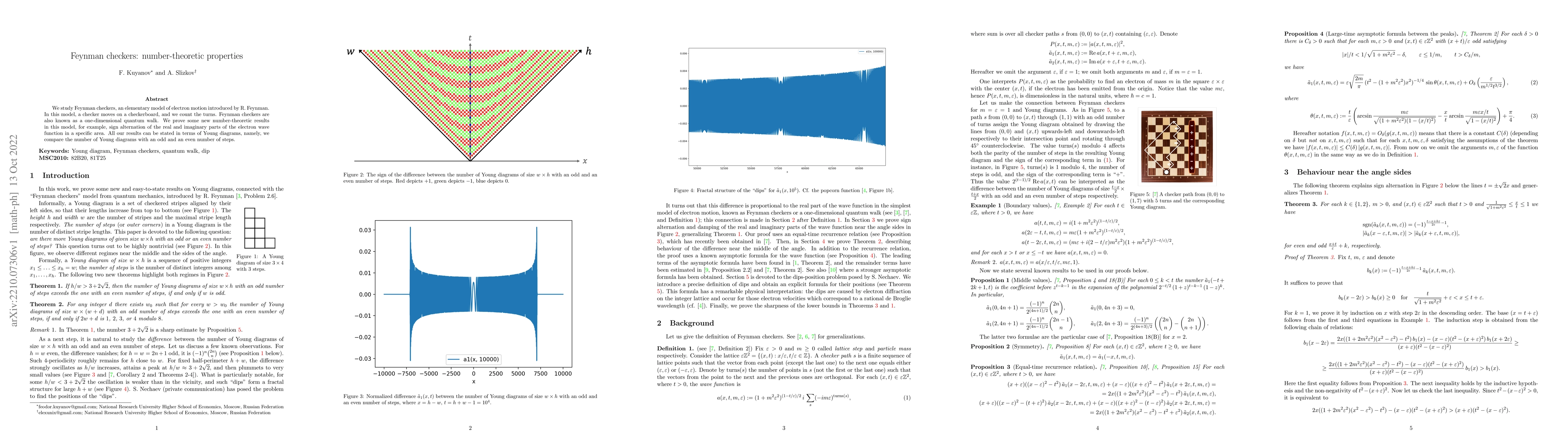 We study Feynman checkers, an elementary model of electron motion introduced by R. Feynman. In this model, a checker moves on a checkerboard, and we count the turns. Feynman checkers are also known as a one-dimensional quantum walk. We prove some new number-theoretic results in this model, for example, sign alternation of the real and imaginary parts of the electron wave function in a specific area. All our results can be stated in terms of Young diagrams, namely, we compare the number of Young diagrams with an odd and an even number of steps.