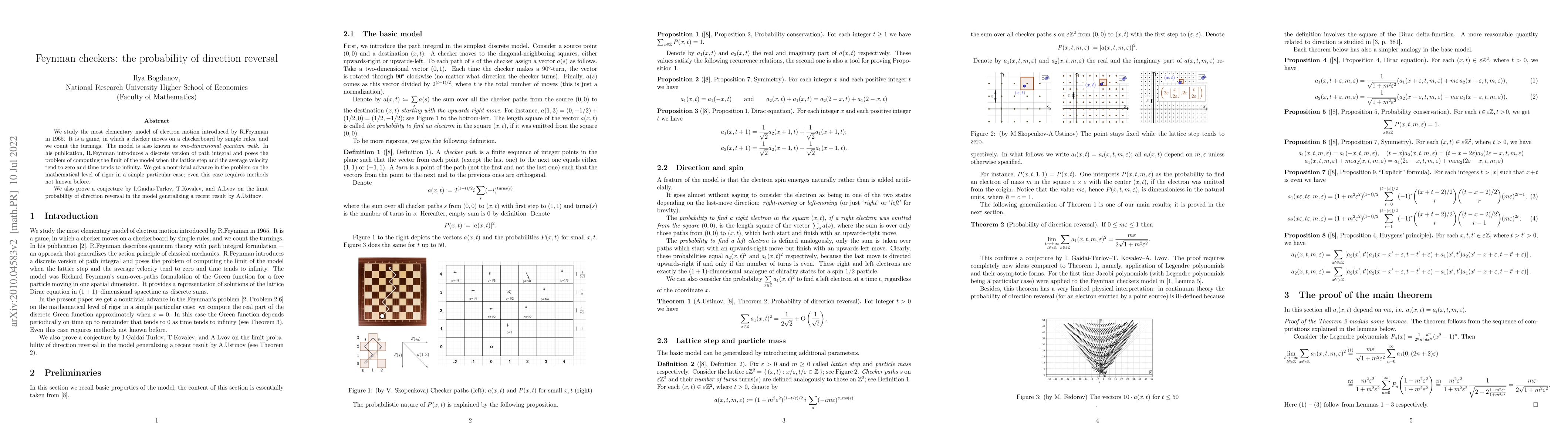 We study the most elementary model of electron motion introduced by R.Feynman in 1965. It is a game, in which a checker moves on a checkerboard by simple rules, and we count the turnings. The model is also known as one-dimensional quantum walk. In his publication, R.Feynman introduces a discrete version of path integral and poses the problem of computing the limit of the model when the lattice step and the average velocity tend to zero and time tends to infinity. We get a nontrivial advance in the problem on the mathematical level of rigor in a simple particular case; even this case requires methods not known before. We also prove a conjecture by I.Gaidai-Turlov, T.Kovalev, and A.Lvov on the limit probability of direction reversal in the model generalizing a recent result by A.Ustinov.