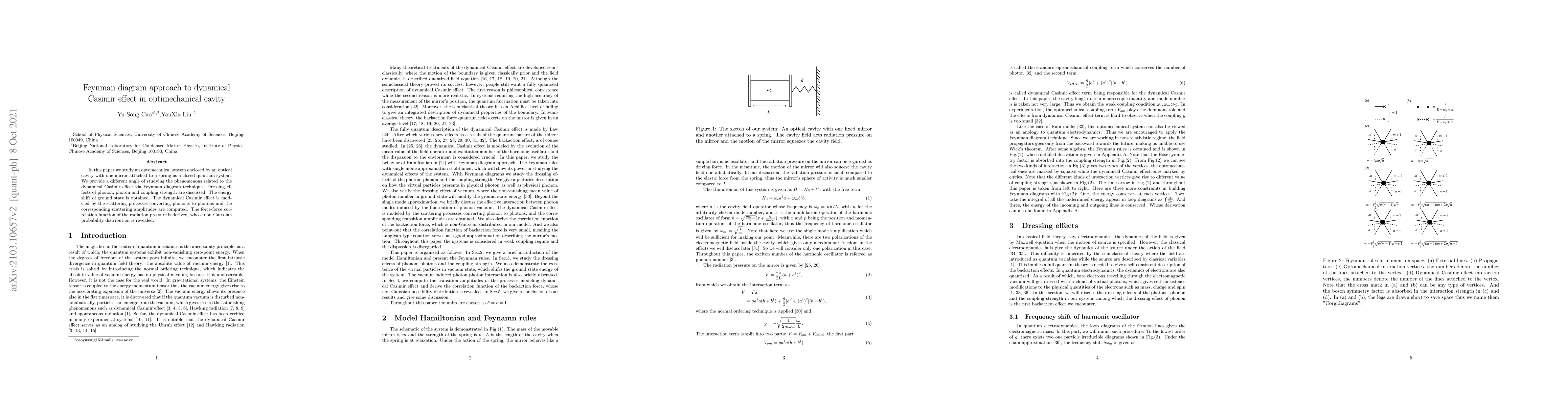 This paper employs Feynman diagram techniques to study the dynamical Casimir effect in an optomechanical system where a mirror is attached to a spring. It investigates the energy shift of the ground state and derives the force-force correlation function, revealing a non-Gaussian probability distribution for the radiation pressure.