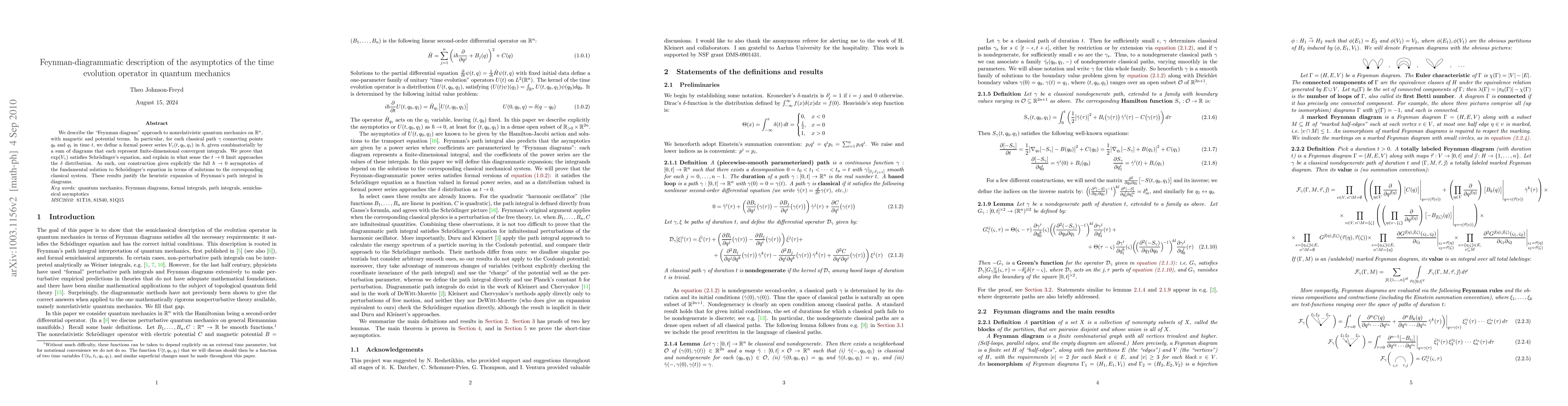 We describe the "Feynman diagram" approach to nonrelativistic quantum mechanics on R^n, with magnetic and potential terms. In particular, for each classical path \gamma connecting points q_0 and q_1 in time t, we define a formal power series V_\gamma(t,q_0,q_1) in \hbar, given combinatorially by a sum of diagrams that each represent finite-dimensional convergent integrals. We prove that exp(V_\gamma) satisfies Schr\"odinger's equation, and explain in what sense the t\to 0 limit approaches the \delta distribution. As such, our construction gives explicitly the full \hbar\to 0 asymptotics of the fundamental solution to Schr\"odinger's equation in terms of solutions to the corresponding classical system. These results justify the heuristic expansion of Feynman's path integral in diagrams.