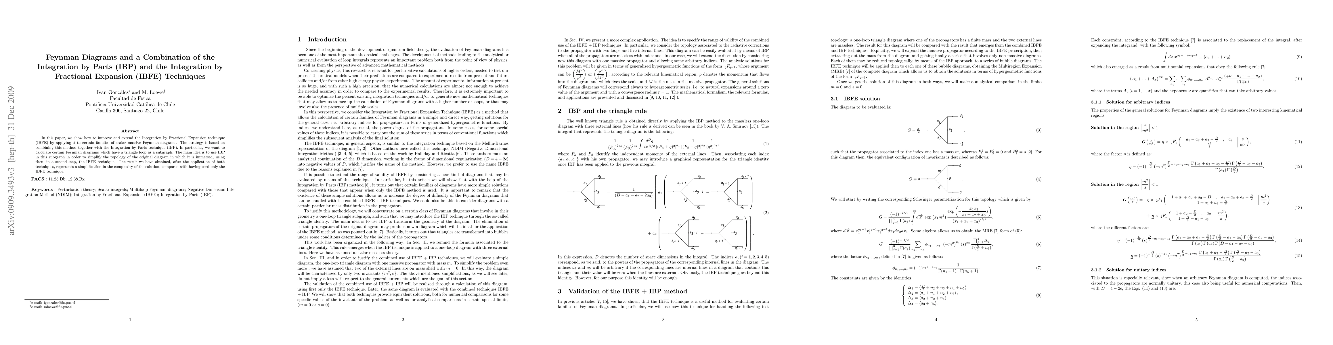 In this paper we show how to improve and extend the Integration by Fractional Expansion technique (IBFE) by applying it to certain families of scalar massive Feynman diagrams. The strategy is based on combining this method together with the Integration by Parts technique (IBP). In particular, we want to calculate certain Feynman diagrams which have a triangle loop as a subgraph. The main idea is to use IBP in this subgraph in order to simplify the topology of the original diagram in which it is immersed, using then, in a second step, the IBFE technique. The result we have obtained, after the application of both techniques, represents a simplification in the complexity of the solution, compared with having used only the IBFE technique.