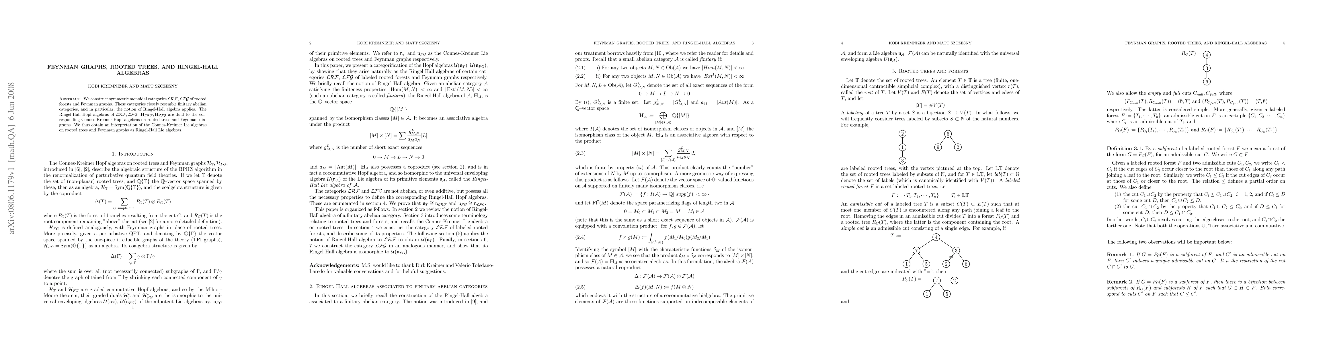 We construct symmetric monoidal categories $\LRF, \FD$ of rooted forests and Feynman graphs. These categories closely resemble finitary abelian categories, and in particular, the notion of Ringel-Hall algebra applies. The Ringel-Hall Hopf algebras of $\LRF, \FD$, $\HH_{\LRF}, \HH_{\FD}$ are dual to the corresponding Connes-Kreimer Hopf algebras on rooted trees and Feynman graphs. We thus obtain an interpretation of the Connes-Kreimer Lie algebras on rooted trees and Feynman graphs as Ringel-Hall Lie algebras.