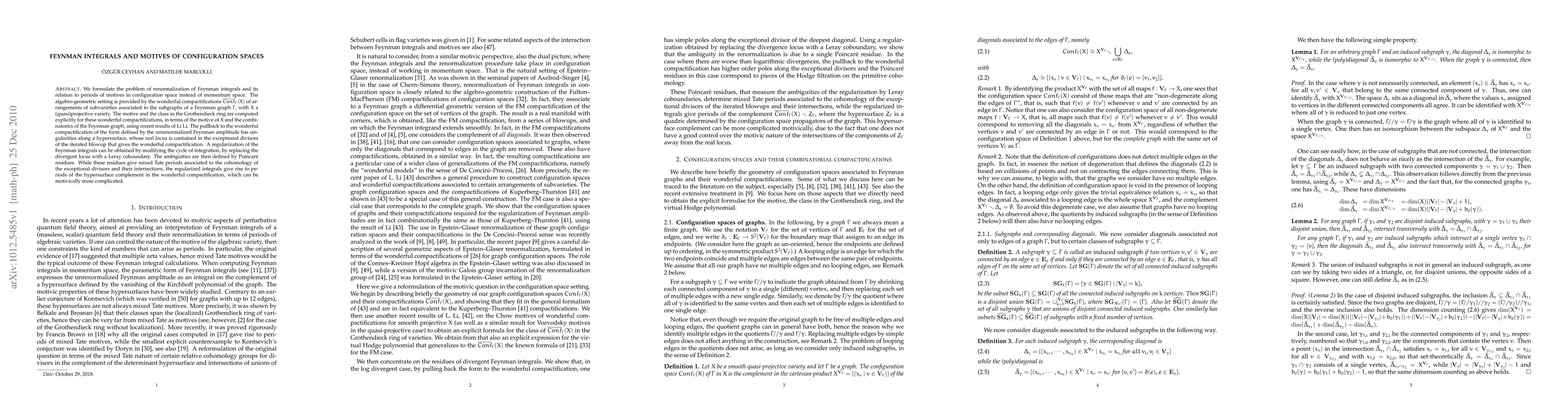 We formulate the problem of renormalization of Feynman integrals and its relation to periods of motives in configuration space instead of momentum space. The algebro-geometric setting is provided by the wonderful compactifications of arrangements of subvarieties associated to the subgraphs of a Feynman graph and a (quasi)projective variety. The motive and the class in the Grothendieck ring are computed explicitly for these wonderful compactifications, in terms of the motive of the variety and the combinatorics of the Feynman graph, using recent results of Li Li. The pullback to the wonderful compactification of the form defined by the unrenormalized Feynman amplitude has singularities along a hypersurface, whose real locus is contained in the exceptional divisors of the iterated blowup that gives the wonderful compactification. A regularization of the Feynman integrals can be obtained by modifying the cycle of integration, by replacing the divergent locus with a Leray coboundary. The ambiguities are then defined by Poincare' residues. While these residues give mixed Tate periods associated to the cohomology of the exceptional divisors and their intersections, the regularized integrals give rise to periods of the hypersurface complement in the wonderful compactification, which can be motivically more complicated.