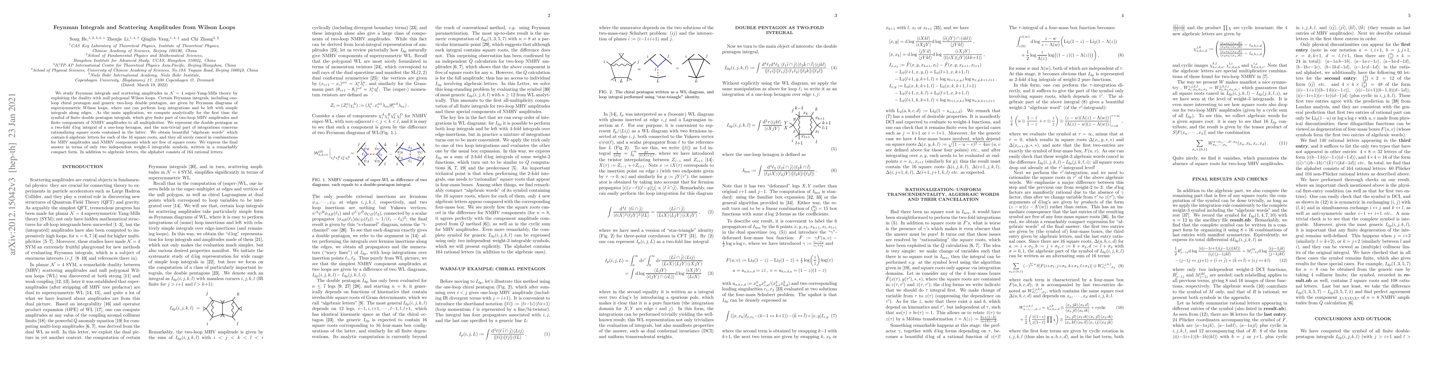 We study Feynman integrals and scattering amplitudes in ${\cal N}=4$ super-Yang-Mills by exploiting the duality with null polygonal Wilson loops. Certain Feynman integrals, including one-loop and two-loop chiral pentagons, are given by Feynman diagrams of a supersymmetric Wilson loop, where one can perform loop integrations and be left with simple integrals along edges. As the main application, we compute analytically for the first time, the symbol of the generic ($n\geq 12$) double pentagon, which gives two-loop MHV amplitudes and components of NMHV amplitudes to all multiplicities. We represent the double pentagon as a two-fold $\mathrm{d} \log$ integral of a one-loop hexagon, and the non-trivial part of the integration lies at rationalizing square roots contained in the latter. We obtain a remarkably compact "algebraic words" which contain $6$ algebraic letters for each of the $16$ square roots, and they all nicely cancel in combinations for MHV amplitudes and NMHV components which are free of square roots. In addition to $96$ algebraic letters, the alphabet consists of $152$ dual conformal invariant combinations of rational letters.