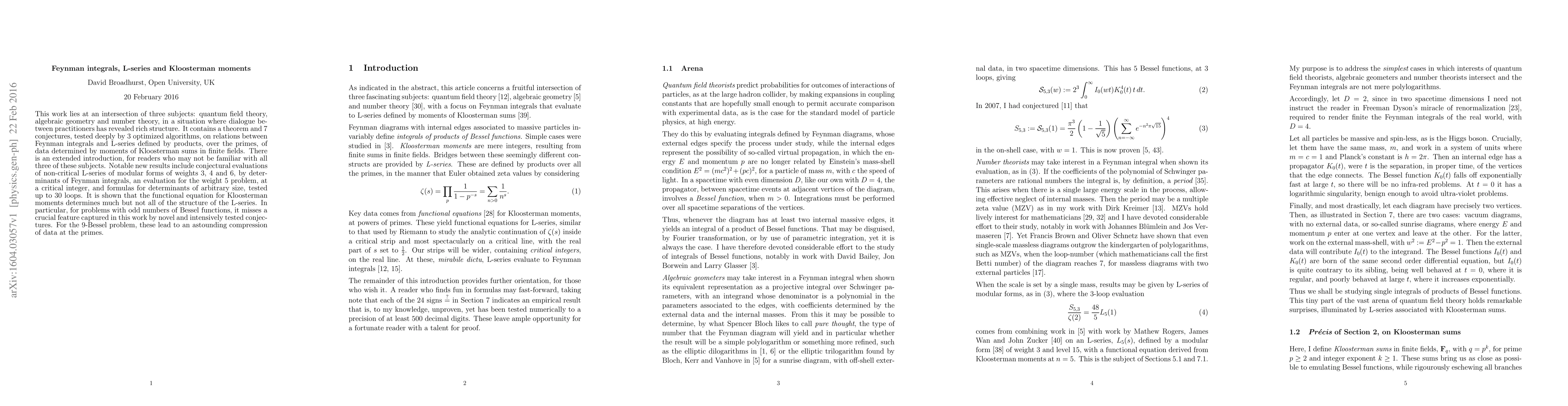 This work lies at an intersection of three subjects: quantum field theory, algebraic geometry and number theory, in a situation where dialogue between practitioners has revealed rich structure. It contains a theorem and 7 conjectures, tested deeply by 3 optimized algorithms, on relations between Feynman integrals and L-series defined by products, over the primes, of data determined by moments of Kloosterman sums in finite fields. There is an extended introduction, for readers who may not be familiar with all three of these subjects. Notable new results include conjectural evaluations of non-critical L-series of modular forms of weights 3, 4 and 6, by determinants of Feynman integrals, an evaluation for the weight 5 problem, at a critical integer, and formulas for determinants of arbitrary size, tested up to 30 loops. It is shown that the functional equation for Kloosterman moments determines much but not all of the structure of the L-series. In particular, for problems with odd numbers of Bessel functions, it misses a crucial feature captured in this work by novel and intensively tested conjectures. For the 9-Bessel problem, these lead to an astounding compression of data at the primes.