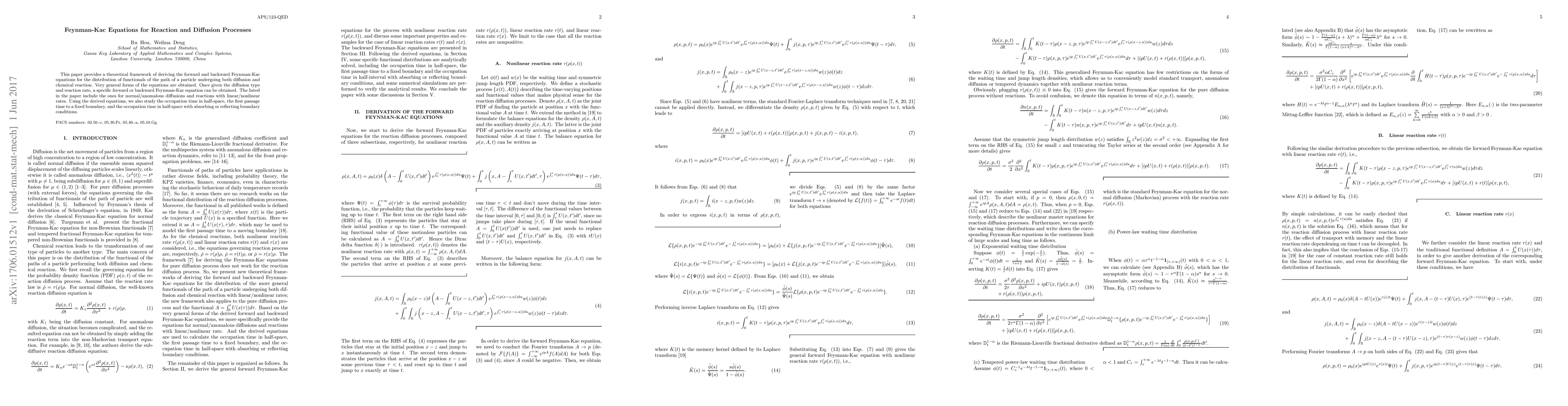 This paper derives general forward and backward Feynman-Kac equations for functionals of the path of particles undergoing both diffusion and chemical reactions. It studies occupation times, first passage times, and boundary conditions for various diffusion and reaction scenarios.