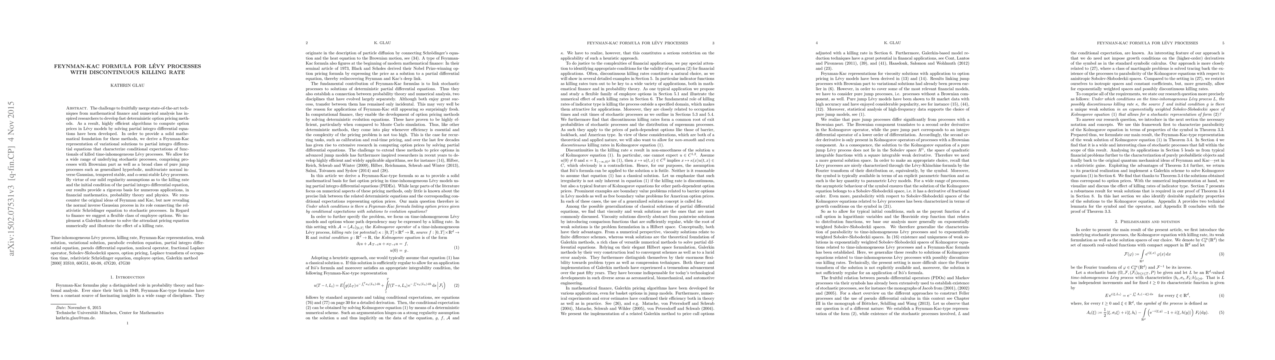 The paper derives a Feynman-Kac formula for variational solutions to partial integro-differential equations characterizing conditional expectations in L\'evy processes with discontinuous killing rates, providing a rigorous foundation for efficient option pricing and applications in financial mathematics, probability theory, and quantum mechanics.