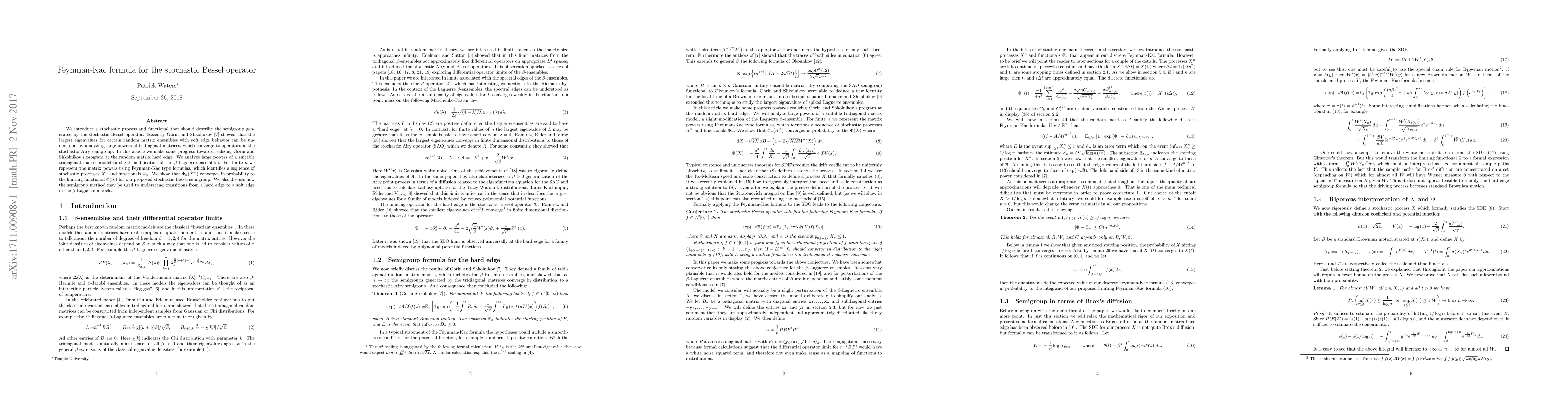 Researchers develop a Feynman-Kac formula to analyze the stochastic Bessel operator, which helps understand transitions between hard edge and soft edge behavior in random matrix ensembles.