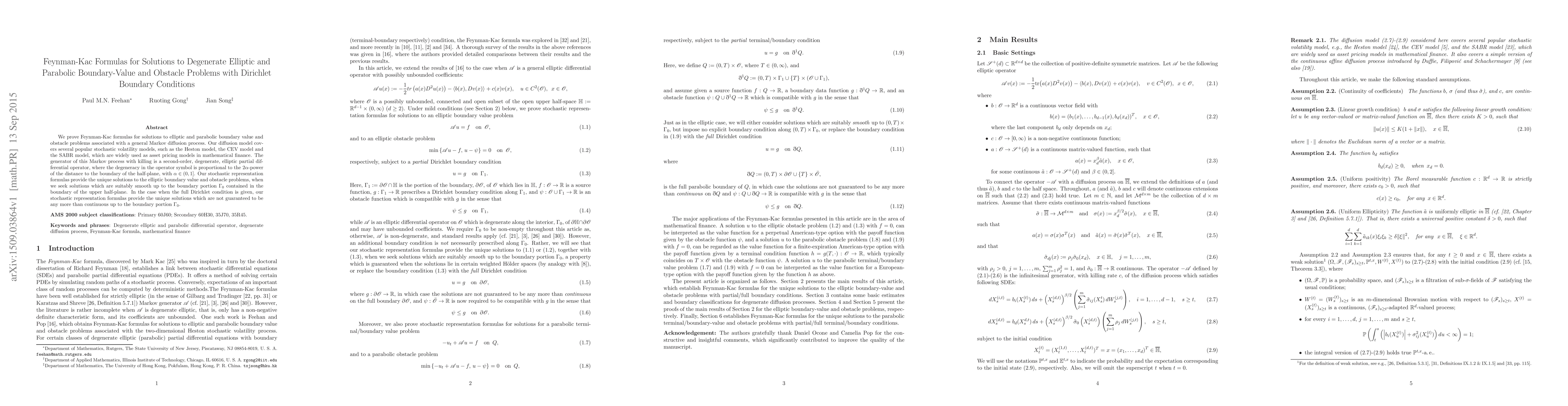 This paper proves Feynman-Kac formulas for solutions to degenerate elliptic and parabolic boundary-value and obstacle problems using a Markov diffusion process. The results apply to popular stochastic volatility models in mathematical finance, providing unique solutions under suitable smoothness conditions.