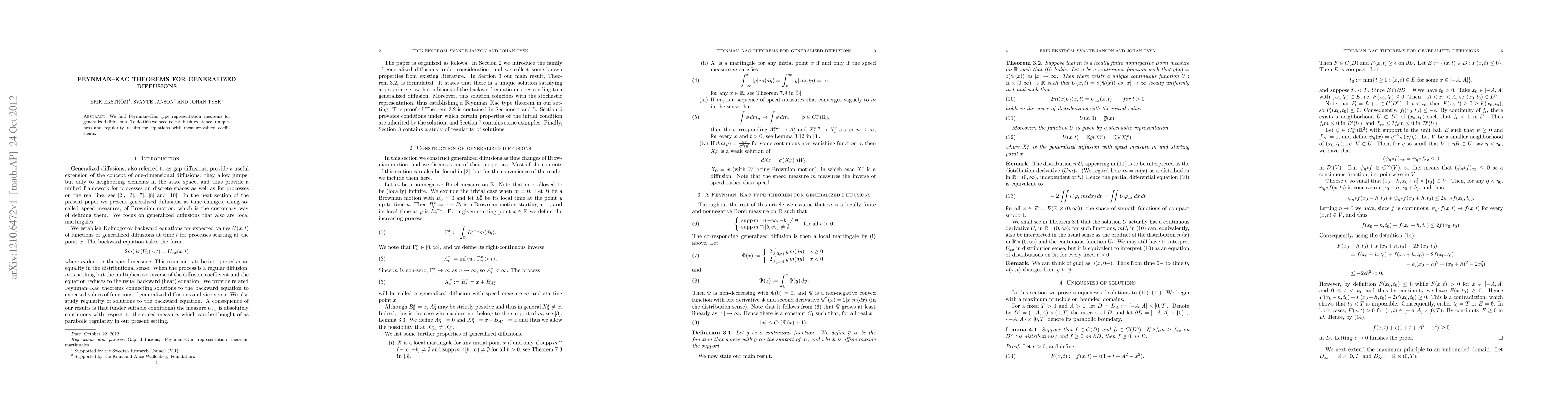 Summary: This paper establishes Feynman-Kac type representation theorems for generalized diffusions, relying on the existence, uniqueness, and regularity of solutions to equations featuring measure-valued coefficients.