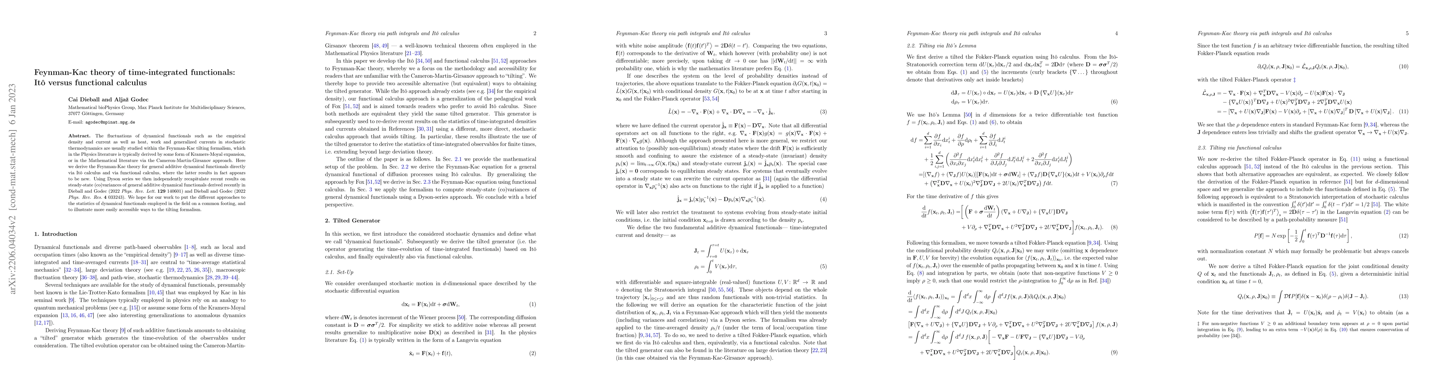 The fluctuations of dynamical functionals such as the empirical density and current as well as heat, work and generalized currents in stochastic thermodynamics are usually studied within the Feynman-Kac tilting formalism, which in the Physics literature is typically derived by some form of Kramers-Moyal expansion, or in the Mathematical literature via the Cameron-Martin-Girsanov approach. Here we derive the Feynman-Kac theory for general additive dynamical functionals directly via It\^o calculus and via functional calculus, where the latter result in fact appears to be new. Using Dyson series we then independently recapitulate recent results on steady-state (co)variances of general additive dynamical functionals derived recently in Dieball and Godec ({2022 \textit{Phys. Rev. Lett.}~\textbf{129} 140601}) and Dieball and Godec ({2022 \textit{Phys. Rev. Res.}~\textbf{4} 033243}). We hope for our work to put the different approaches to the statistics of dynamical functionals employed in the field on a common footing, and to illustrate more easily accessible ways to the tilting formalism.