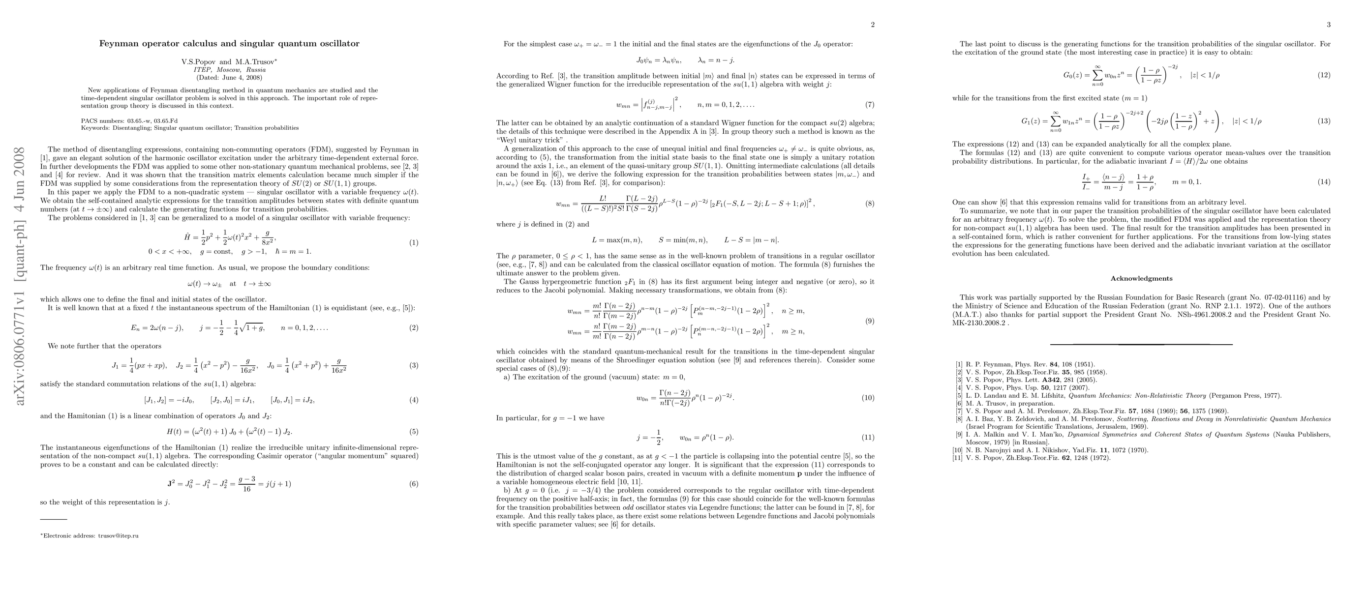 This paper applies Feynman operator calculus to solve the time-dependent singular oscillator problem in quantum mechanics, leveraging representation group theory.