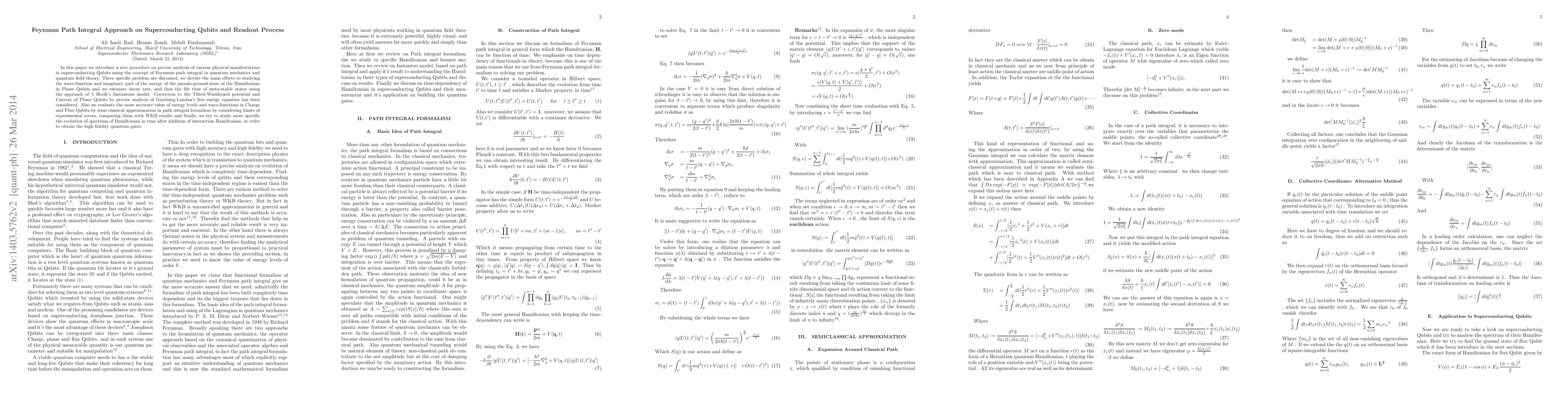 In this paper we introduce a new procedure on precise analysis of various physical manifestations in superconducting Qubits using the concept of Feynman path integral in quantum mechanics and quantum field theory. Three specific problem are discussed, we devote the main efforts to studying the wave function and imaginary part of the energy of the pseudo ground state of the Hamiltonian in Phase Qubits and we estimate decay rate, and thus the life time of meta stable states using the approach of 't Hooft's Instantons model. Correction to the Tilted-Washboard potential and current of Phase Qubits by precise analysis of Ginzburg-Landau's free energy equation has been considered. Also we evaluate the most accurate value of energy levels and wave function in Charge and Flux Qubits by Semi classical approximation in path integral formalism by considering limits of experimental errors, comparing them with WKB results and finally, we try to study more specific the evolution of spectrum of Hamiltonian in time after addition of interaction Hamiltonian, in order to obtain the high fidelity quantum gates.