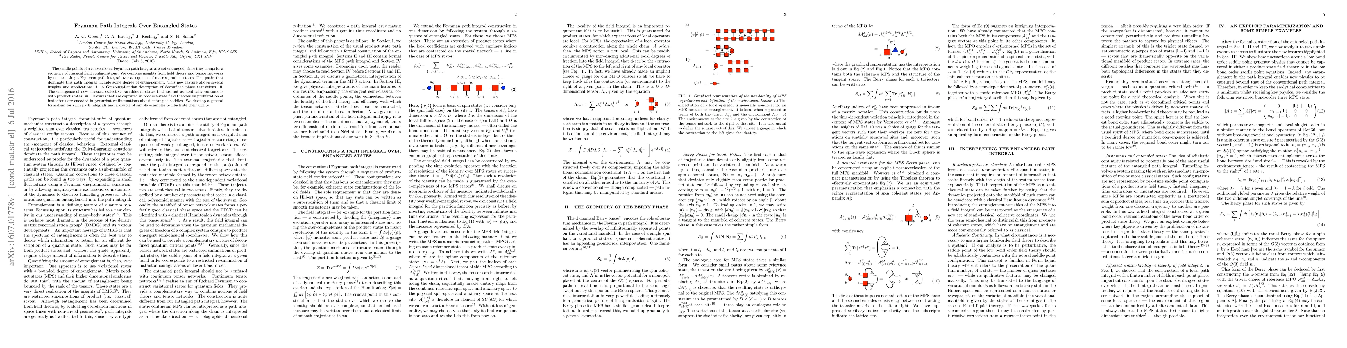 The saddle points of a conventional Feynman path integral are not entangled, since they comprise a sequence of classical field configurations. We combine insights from field theory and tensor networks by constructing a Feynman path integral over a sequence of matrix product states. The paths that dominate this path integral include some degree of entanglement. This new feature allows several insights and applications: i. A Ginzburg-Landau description of deconfined phase transitions. ii. The emergence of new classical collective variables in states that are not adiabatically continuous with product states. iii. Features that are captured in product-state field theories by proliferation of instantons are encoded in perturbative fluctuations about entangled saddles. We develop a general formalism for such path integrals and a couple of simple examples to illustrate their utility.