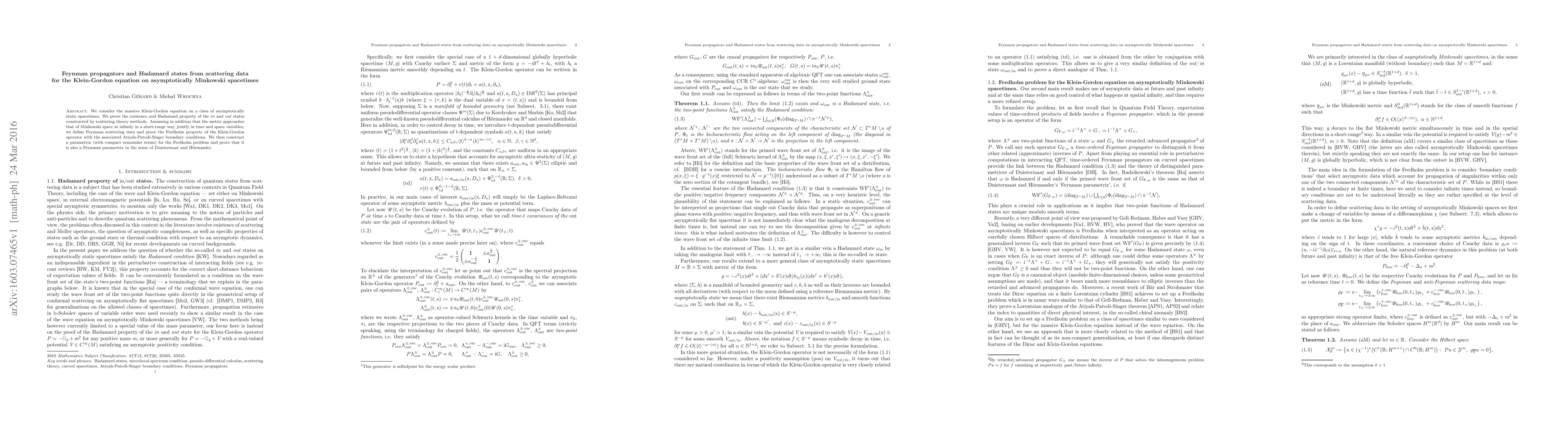 We consider the massive Klein-Gordon equation on a class of asymptotically static spacetimes. We prove the existence and Hadamard property of the in and out states constructed by scattering theory methods. Assuming in addition that the metric approaches that of Minkowski space at infinity in a short-range way, jointly in time and space variables, we define Feynman scattering data and prove the Fredholm property of the Klein-Gordon operator with the associated Atiyah-Patodi-Singer boundary conditions. We then construct a parametrix (with compact remainder terms) for the Fredholm problem and prove that it is also a Feynman parametrix in the sense of Duistermaat and H{\"o}rmander.