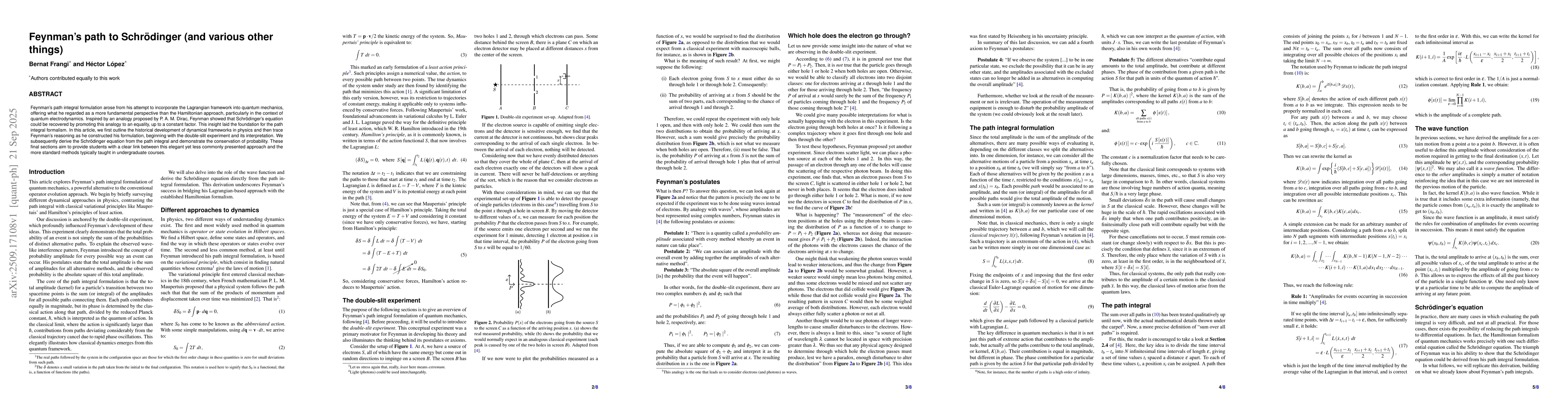 The paper traces Feynman's development of the path integral formulation, analyzes the double-slit experiment, and derives the Schrödinger equation from the path integral approach while examining probability conservation.