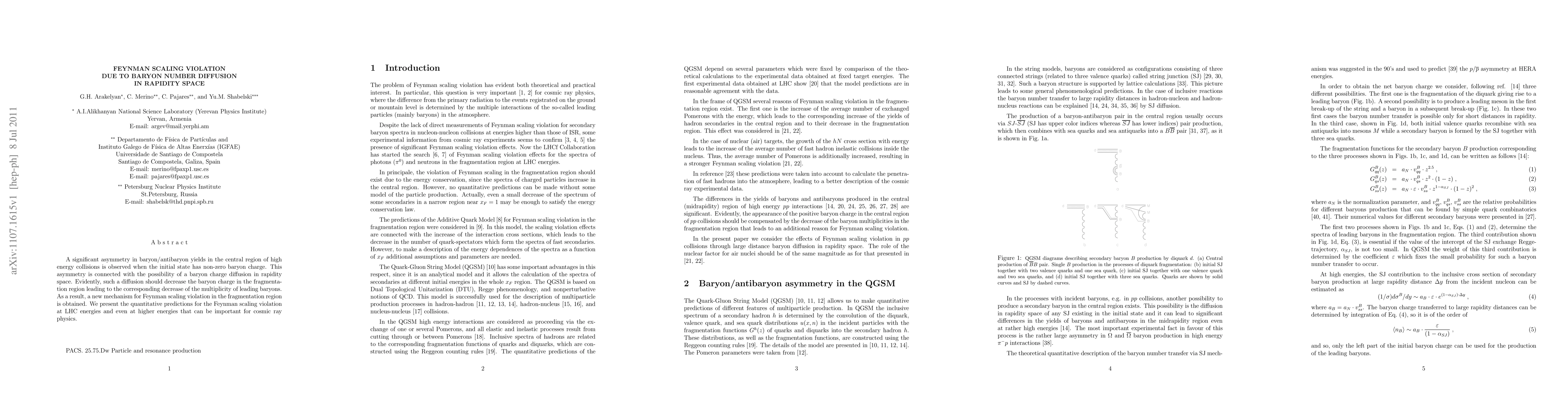 A significant asymmetry in baryon/antibaryon yields in the central region of high energy collisions is observed when the initial state has non-zero baryon charge. This asymmetry is connected with the possibility of a baryon charge diffusion in rapidity space. Evidently, such a diffusion should decrease the baryon charge in the fragmentation region leading to the corresponding decrease of the multiplicity of leading baryons. As a result, a new mechanism for Feynman scaling violation in the fragmentation region is obtained. We present the quantitative predictions for the Feynman scaling violation at LHC energies and even at highier energies that can be important for cosmic ray physics.