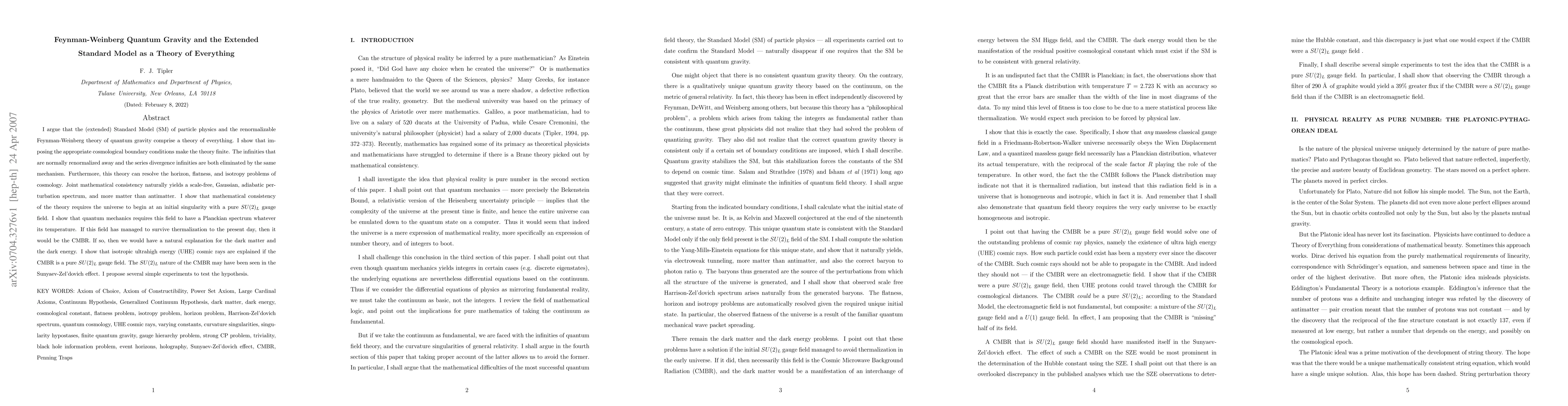 I argue that the (extended) Standard Model (SM) of particle physics and the renormalizable Feynman-Weinberg theory of quantum gravity comprise a theory of everything. I show that imposing the appropriate cosmological boundary conditions make the theory finite. The infinities that are normally renormalized away and the series divergence infinities are both eliminated by the same mechanism. Furthermore, this theory can resolve the horizon, flatness, and isotropy problems of cosmology. Joint mathematical consistency naturally yields a scale-free, Gaussian, adiabatic perturbation spectrum, and more matter than antimatter. I show that mathematical consistency of the theory requires the universe to begin at an initial singularity with a pure $SU(2)_L$ gauge field. I show that quantum mechanics requires this field to have a Planckian spectrum whatever its temperature. If this field has managed to survive thermalization to the present day, then it would be the CMBR. If so, then we would have a natural explanation for the dark matter and the dark energy. I show that isotropic ultrahigh energy (UHE) cosmic rays are explained if the CMBR is a pure $SU(2)_L$ gauge field. The $SU(2)_L$ nature of the CMBR may have been seen in the Sunyaev-Zel'dovich effect. I propose several simple experiments to test the hypothesis.