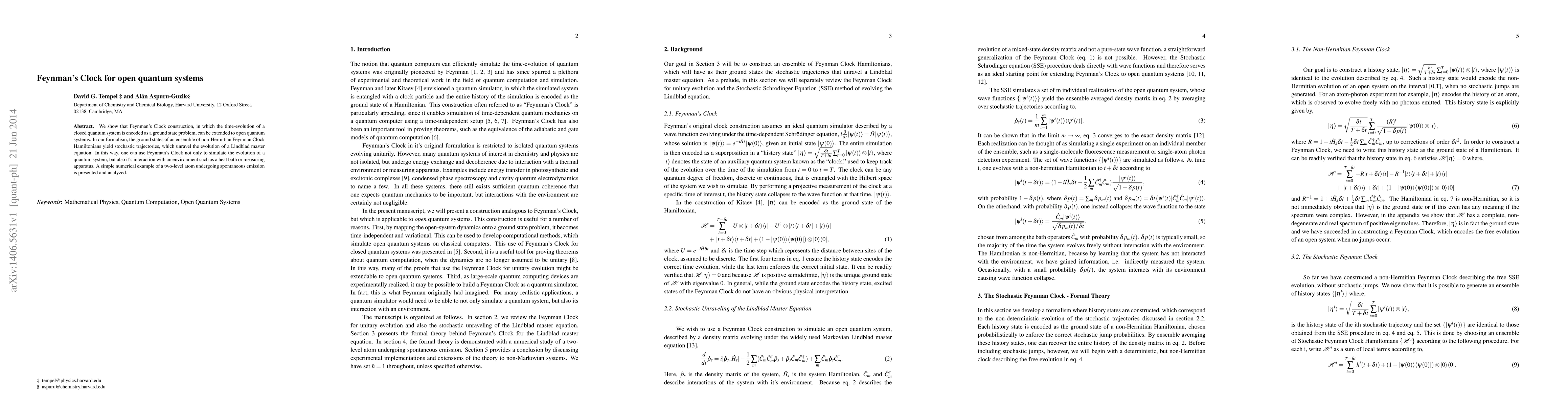 We show that Feynman's Clock construction, in which the time-evolution of a closed quantum system is encoded as a ground state problem, can be extended to open quantum systems. In our formalism, the ground states of an ensemble of non-Hermitian Feynman Clock Hamiltonians yield stochastic trajectories, which unravel the evolution of a Lindblad master equation. In this way, one can use Feynman's Clock not only to simulate the evolution of a quantum system, but also it's interaction with an environment such as a heat bath or measuring apparatus. A simple numerical example of a two-level atom undergoing spontaneous emission is presented and analyzed.