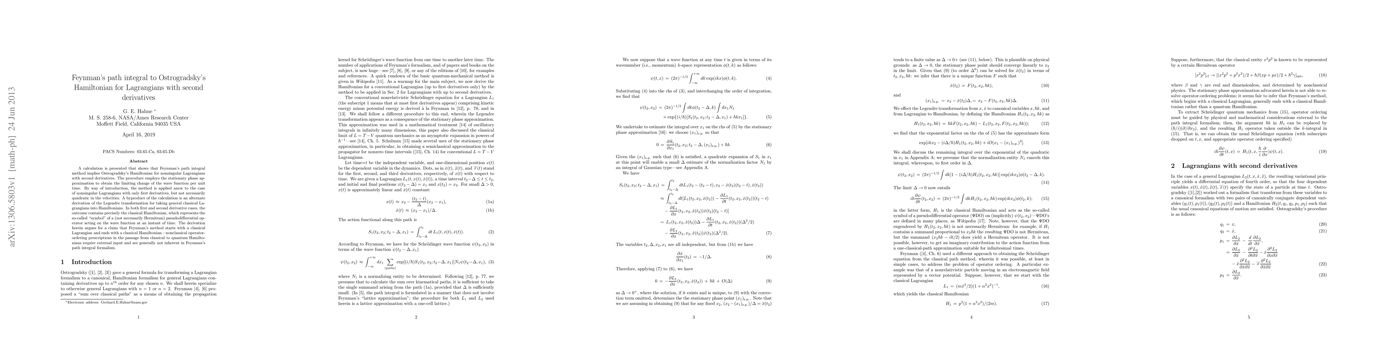 The paper presents a calculation that uses the stationary phase approximation to show that Feynman's path integral implies Ostrogradsky's Hamiltonian for nonsingular Lagrangians with second derivatives.