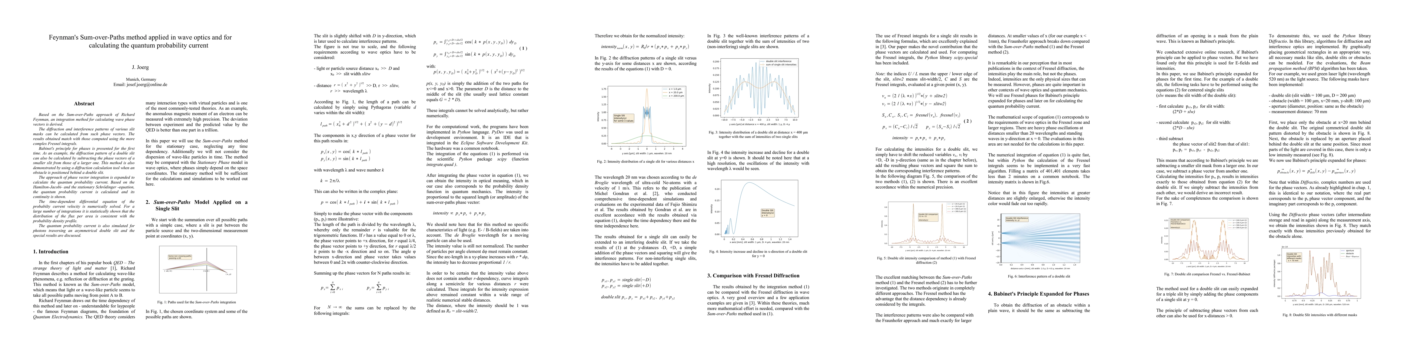 This paper applies Feynman's Sum-over-Paths method to derive an integration technique for calculating wave phase vectors, enabling accurate diffraction and interference pattern calculations. It extends this approach to calculate the quantum probability current, demonstrating its consistency with the probability density profile and simulating photon behavior through asymmetrical double slits.