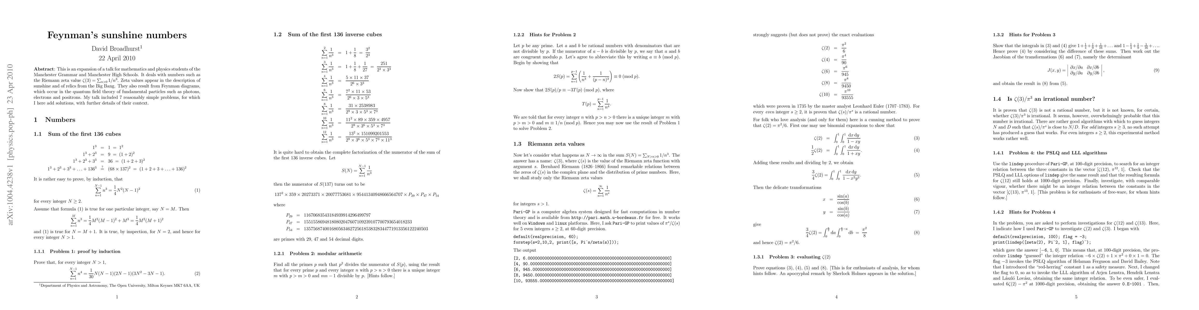 This is an expansion of a talk for mathematics and physics students of the Manchester Grammar and Manchester High Schools. It deals with numbers such as the Riemann zeta value zeta(3)=sum_{n>0}1/n^3. Zeta values appear in the description of sunshine and of relics from the Big Bang. They also result from Feynman diagrams, which occur in the quantum field theory of fundamental particles such as photons, electrons and positrons. My talk included 7 reasonably simple problems, for which I here add solutions, with further details of their context.