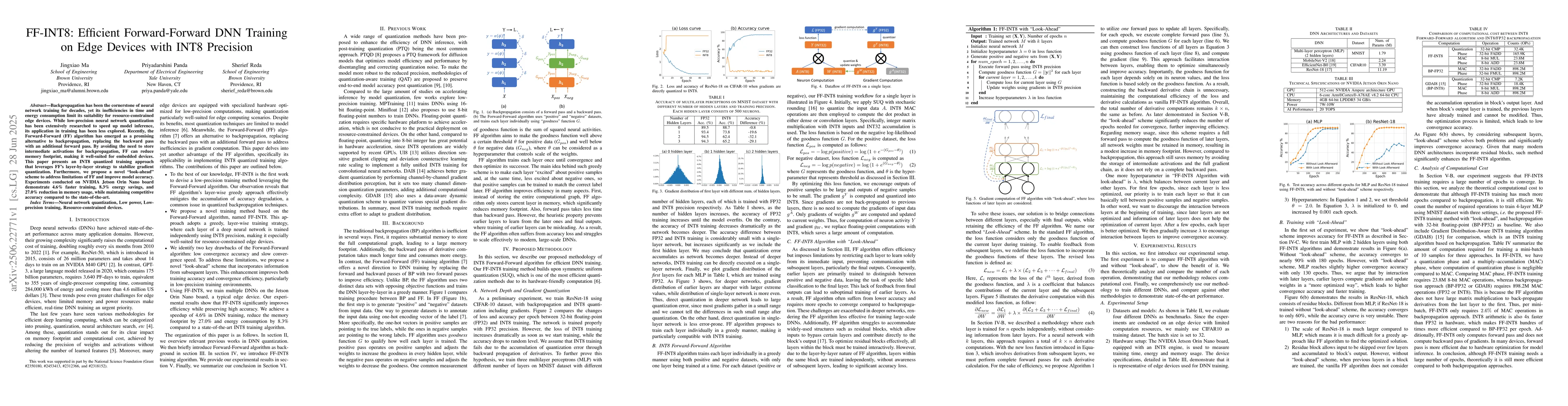 Backpropagation has been the cornerstone of neural network training for decades, yet its inefficiencies in time and energy consumption limit its suitability for resource-constrained edge devices. While low-precision neural network quantization has been extensively researched to speed up model inference, its application in training has been less explored. Recently, the Forward-Forward (FF) algorithm has emerged as a promising alternative to backpropagation, replacing the backward pass with an additional forward pass. By avoiding the need to store intermediate activations for backpropagation, FF can reduce memory footprint, making it well-suited for embedded devices. This paper presents an INT8 quantized training approach that leverages FF's layer-by-layer strategy to stabilize gradient quantization. Furthermore, we propose a novel "look-ahead" scheme to address limitations of FF and improve model accuracy. Experiments conducted on NVIDIA Jetson Orin Nano board demonstrate 4.6% faster training, 8.3% energy savings, and 27.0% reduction in memory usage, while maintaining competitive accuracy compared to the state-of-the-art.