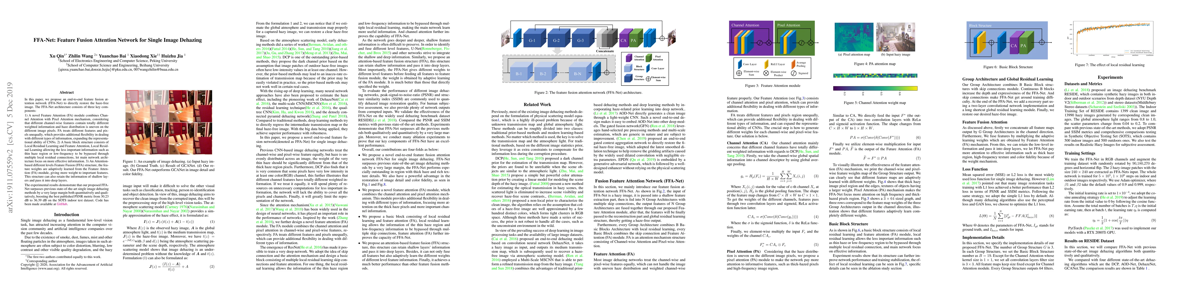 FFA-Net is an end-to-end attention network for single image dehazing, utilizing a Feature Attention module, Local Residual Learning, and an adaptive Feature Fusion structure to enhance representational ability and improve performance, achieving superior results over previous methods.