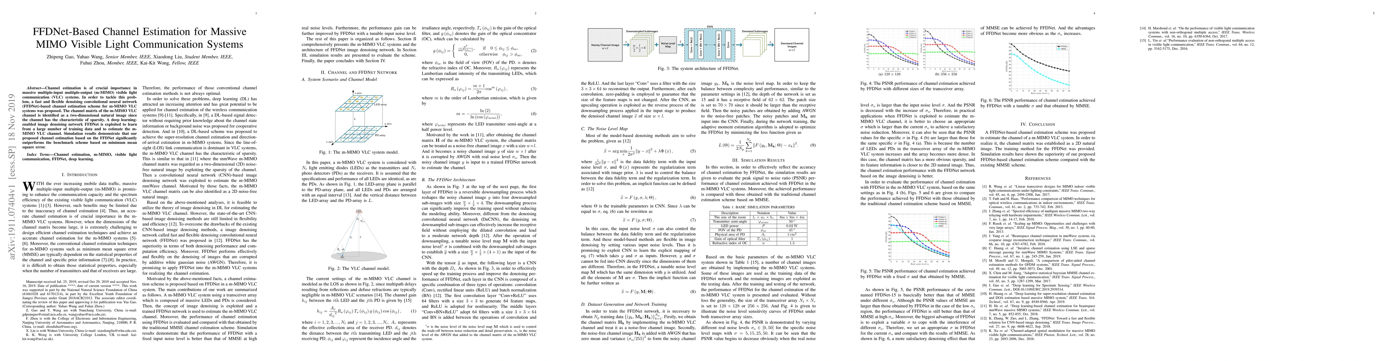 A Fast and Flexible Denoising Convolutional Neural Network (FFDNet)-based channel estimation scheme was proposed for massive Multiple-Input Multiple-Output (m-MIMO) Visible Light Communication (VLC) systems. The channel matrix is treated as a noise-free image and corrupted by Additive White Gaussian Noise (AWGN) to form a noisy channel image, which is then input into a trained FFDNet network for channel estimation.