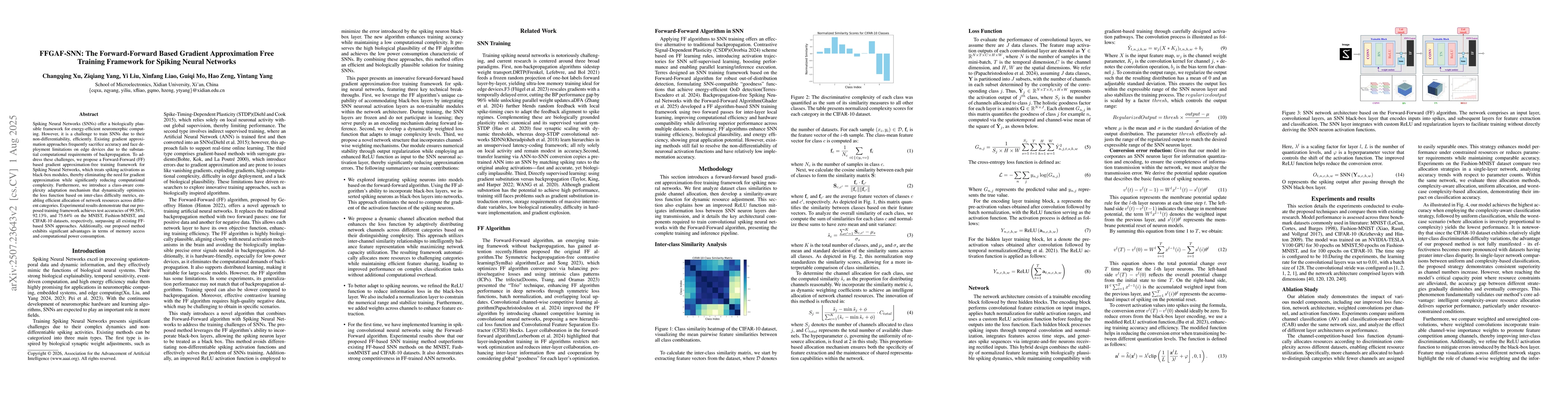 Spiking Neural Networks (SNNs) offer a biologically plausible framework for energy-efficient neuromorphic computing. However, it is a challenge to train SNNs due to their non-differentiability, efficiently. Existing gradient approximation approaches frequently sacrifice accuracy and face deployment limitations on edge devices due to the substantial computational requirements of backpropagation. To address these challenges, we propose a Forward-Forward (FF) based gradient approximation-free training framework for Spiking Neural Networks, which treats spiking activations as black-box modules, thereby eliminating the need for gradient approximation while significantly reducing computational complexity. Furthermore, we introduce a class-aware complexity adaptation mechanism that dynamically optimizes the loss function based on inter-class difficulty metrics, enabling efficient allocation of network resources across different categories. Experimental results demonstrate that our proposed training framework achieves test accuracies of 99.58%, 92.13%, and 75.64% on the MNIST, Fashion-MNIST, and CIFAR-10 datasets, respectively, surpassing all existing FF-based SNN approaches. Additionally, our proposed method exhibits significant advantages in terms of memory access and computational power consumption.